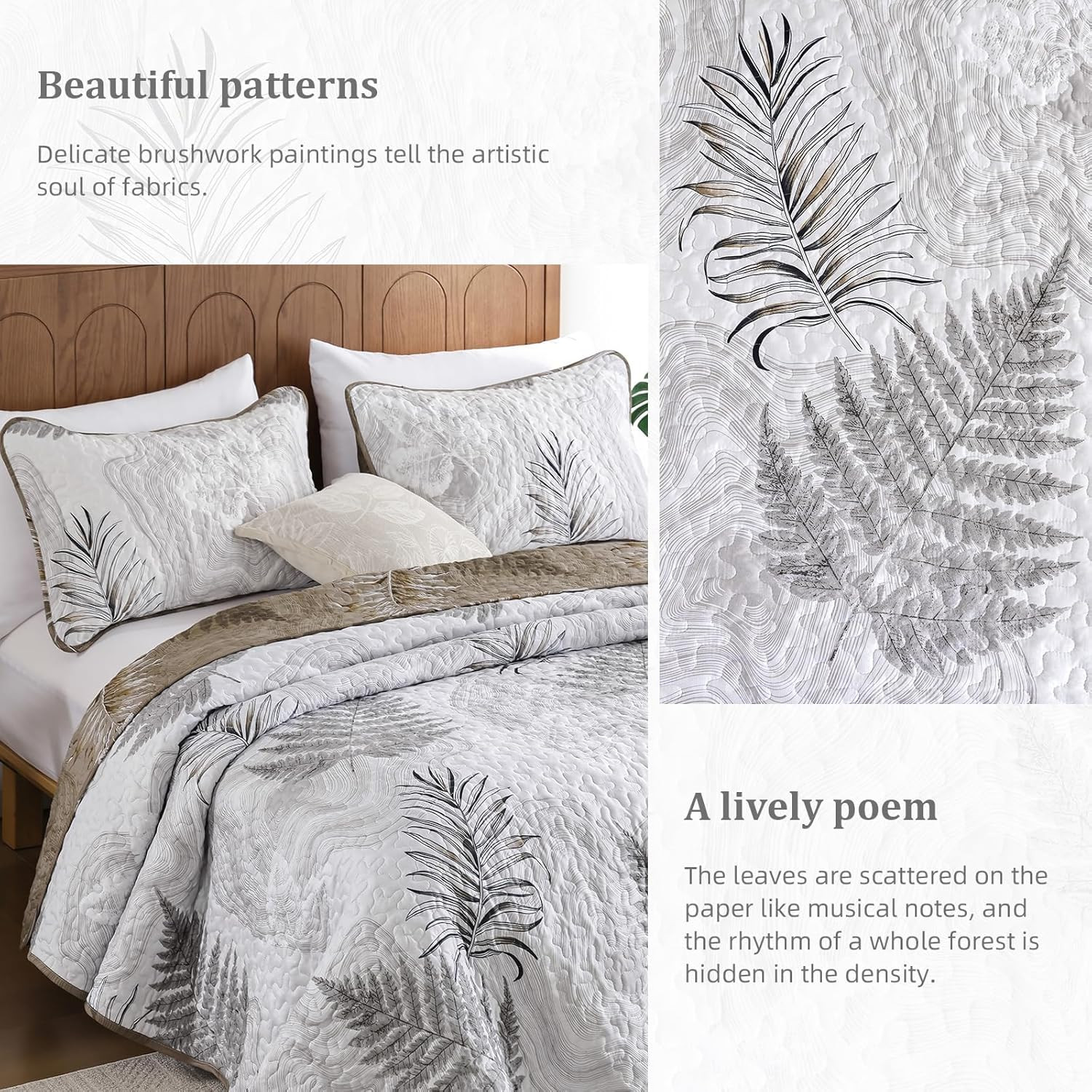 Brown Quilts Set Queen Size, Botanical Bedspread Bedding Set Floral Leaf Pattern