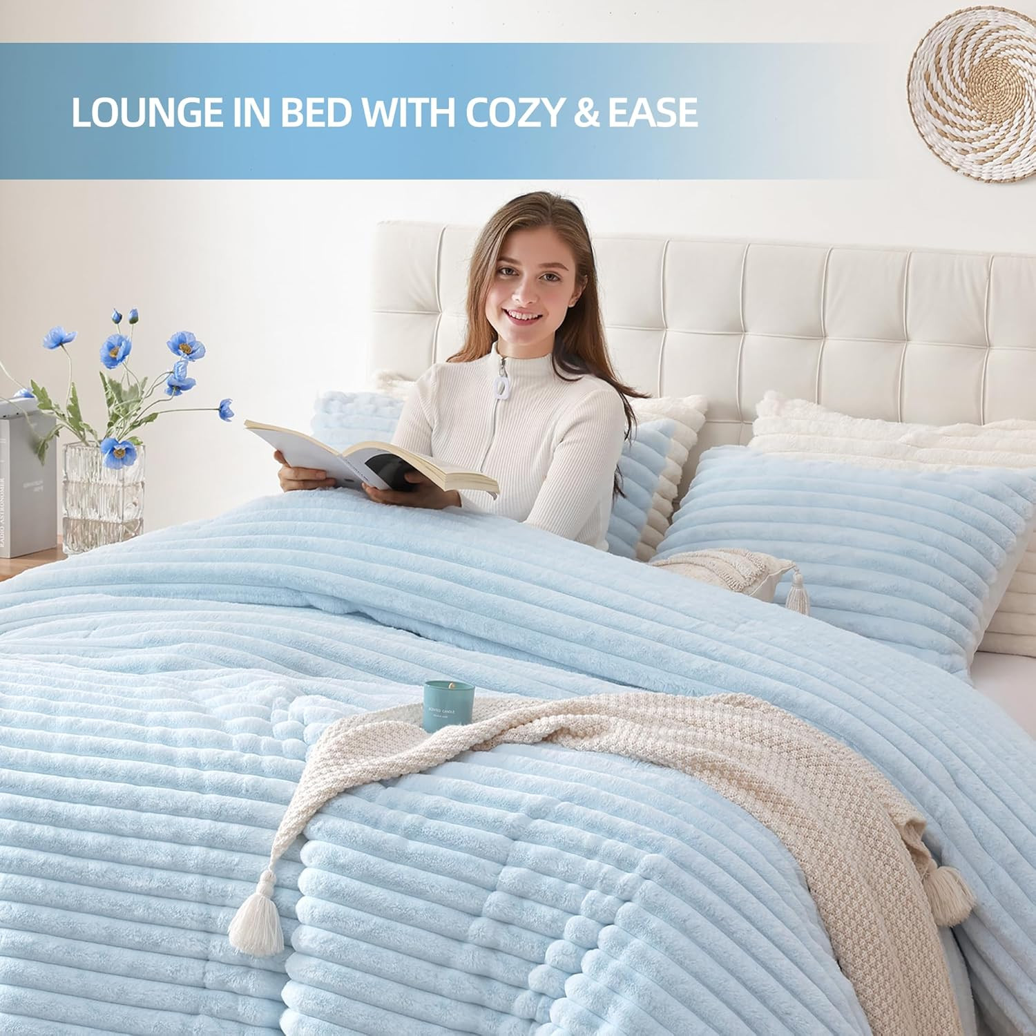 Fluffy Queen Size Comforter Set 3 Pieces - Light Blue Fleece Fluffy Comforter Se