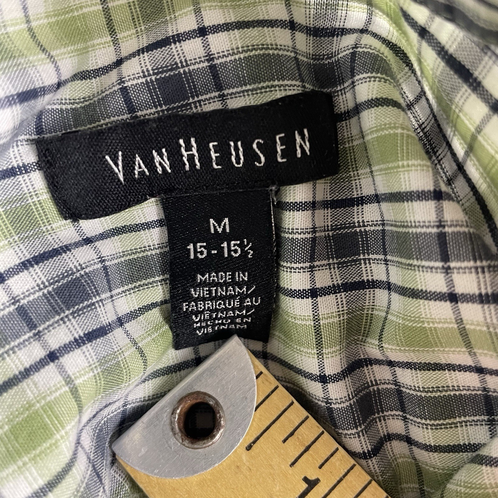 как выглядит Van Heusen Mens M 15-15.5 Short Sleeve Button Up Shirt Green Blue Plaid Casual фото