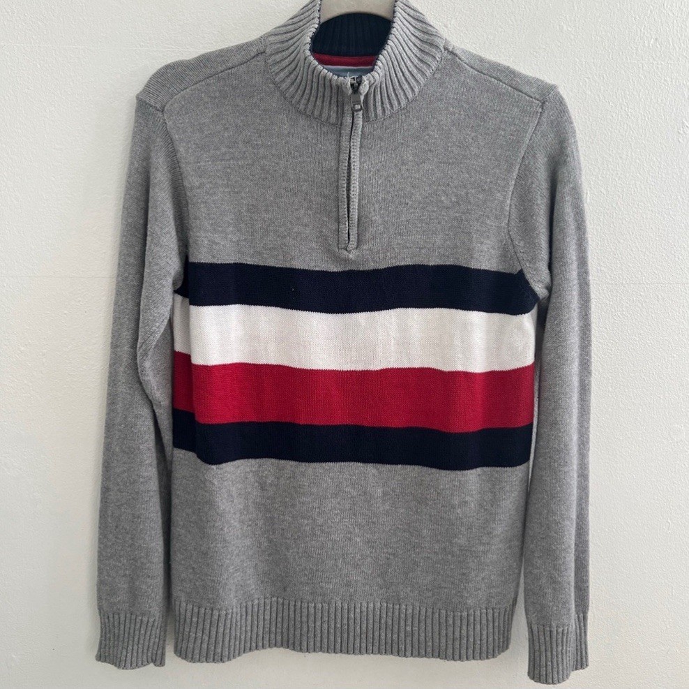 Tommy Hilfiger Young Boys Zip Sweater Gray Stripes Red Blue 16 / 18 LARGE
