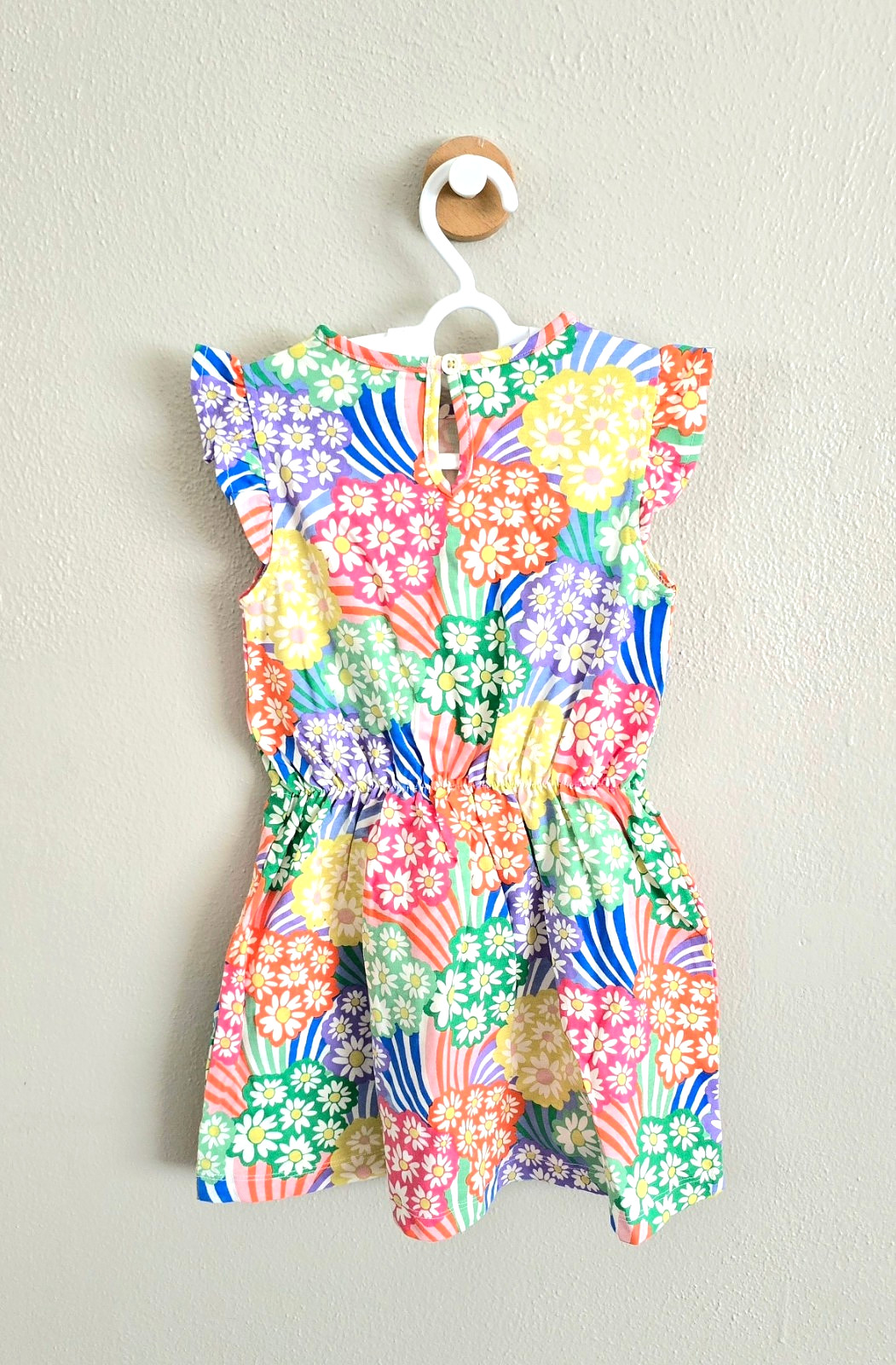 NWOT Mini Boden Girls Frill Sleeve Jersey Dress- Green Rainbow Daisy, Sz 2/3-7/8