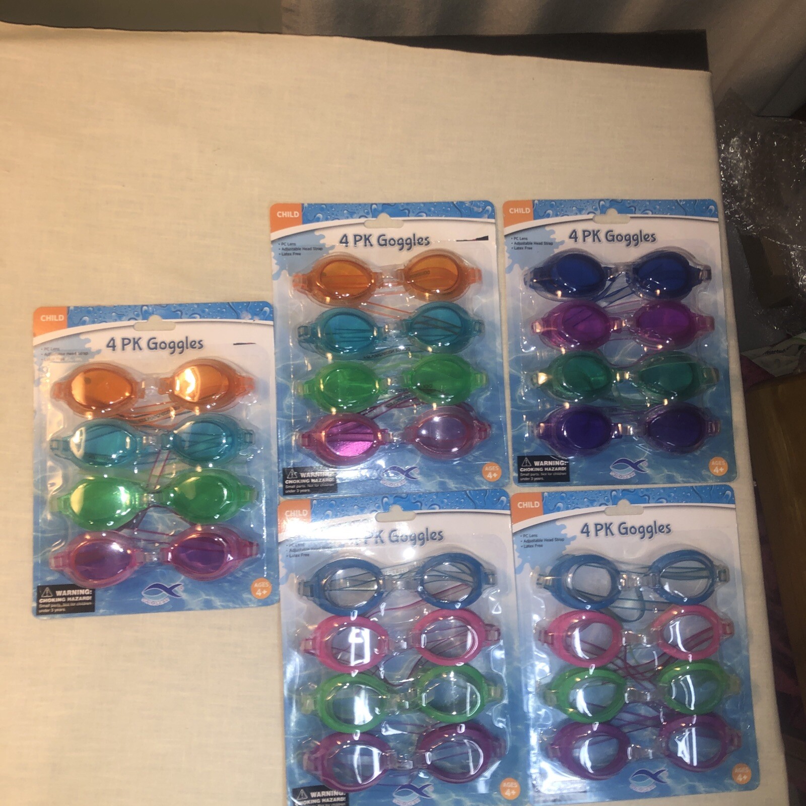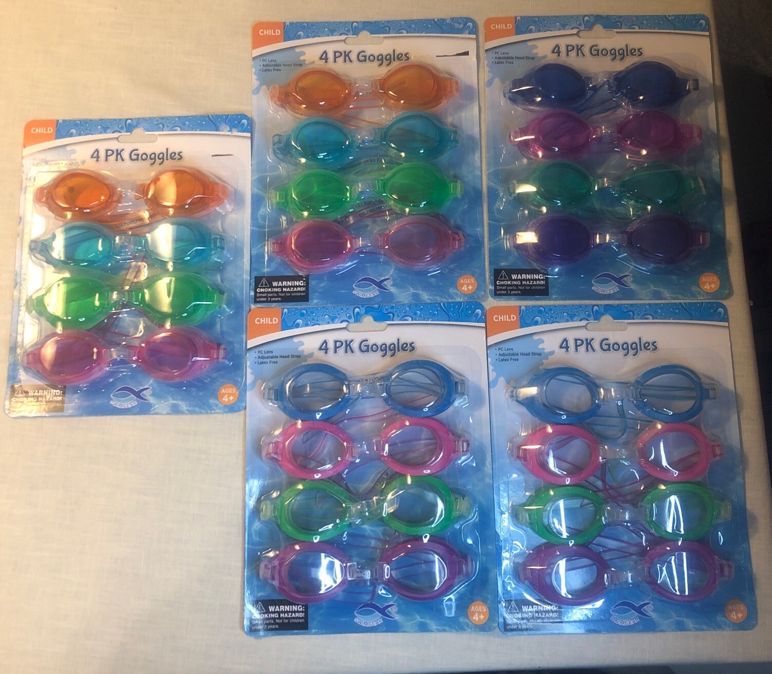 Lot Of 5 SWIMGEAR 4 Pk Child Swim Goggles Adjustable Strap, Multicolors, PC Lens