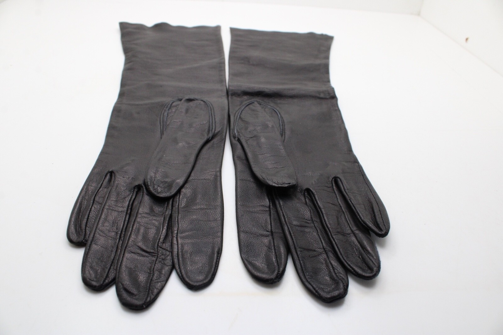 как выглядит Vintage Miss Aris Black 3/4 Length Leather Gloves Size 6 Not Lined 14" Long фото
