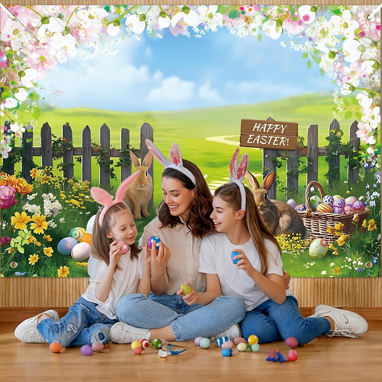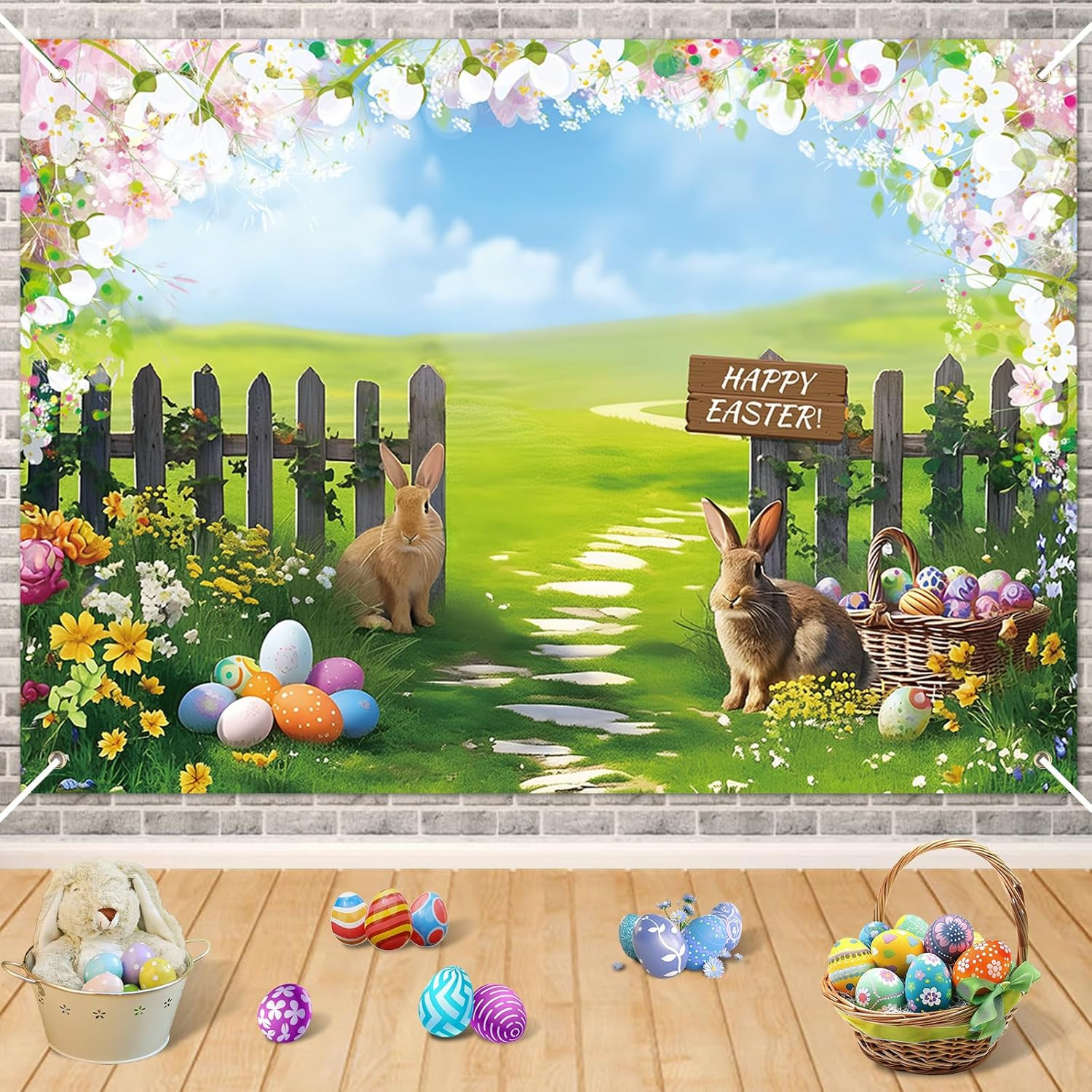 Spring Easter Photography Backdrop, 7X5Ft Happy Easter Bunny Egg Garden Photosho