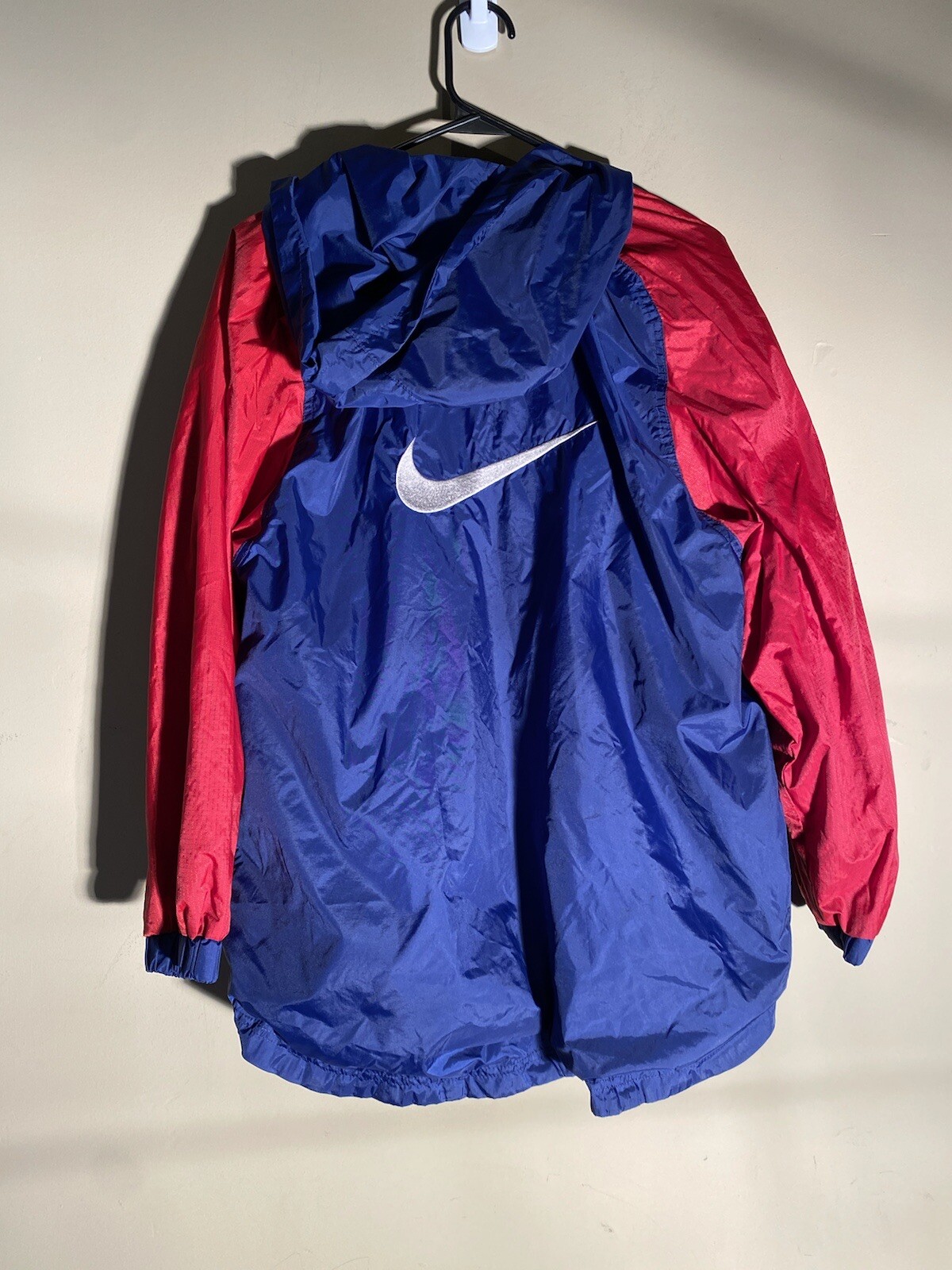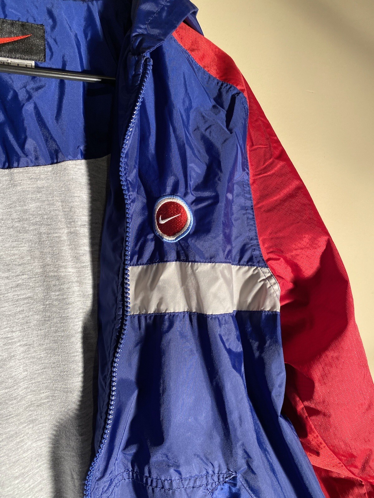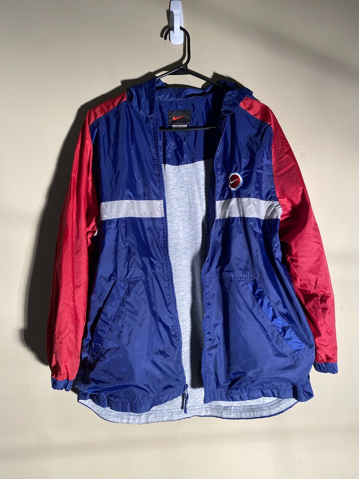 VTG Nike Youth Jacket Large Blue Red Stripe Hooded Windbreaker Full Zip Retro