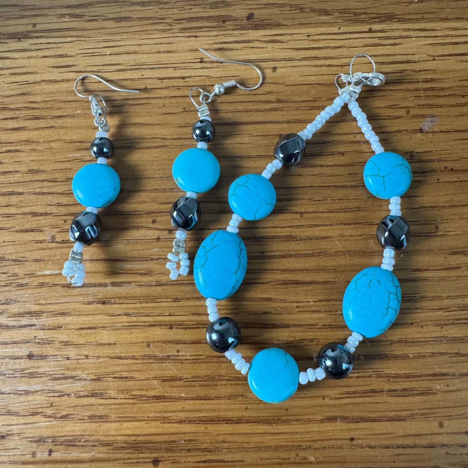 Faux Turquoise Beaded Necklace Bracelet Earrings Set Silver Tone Accents