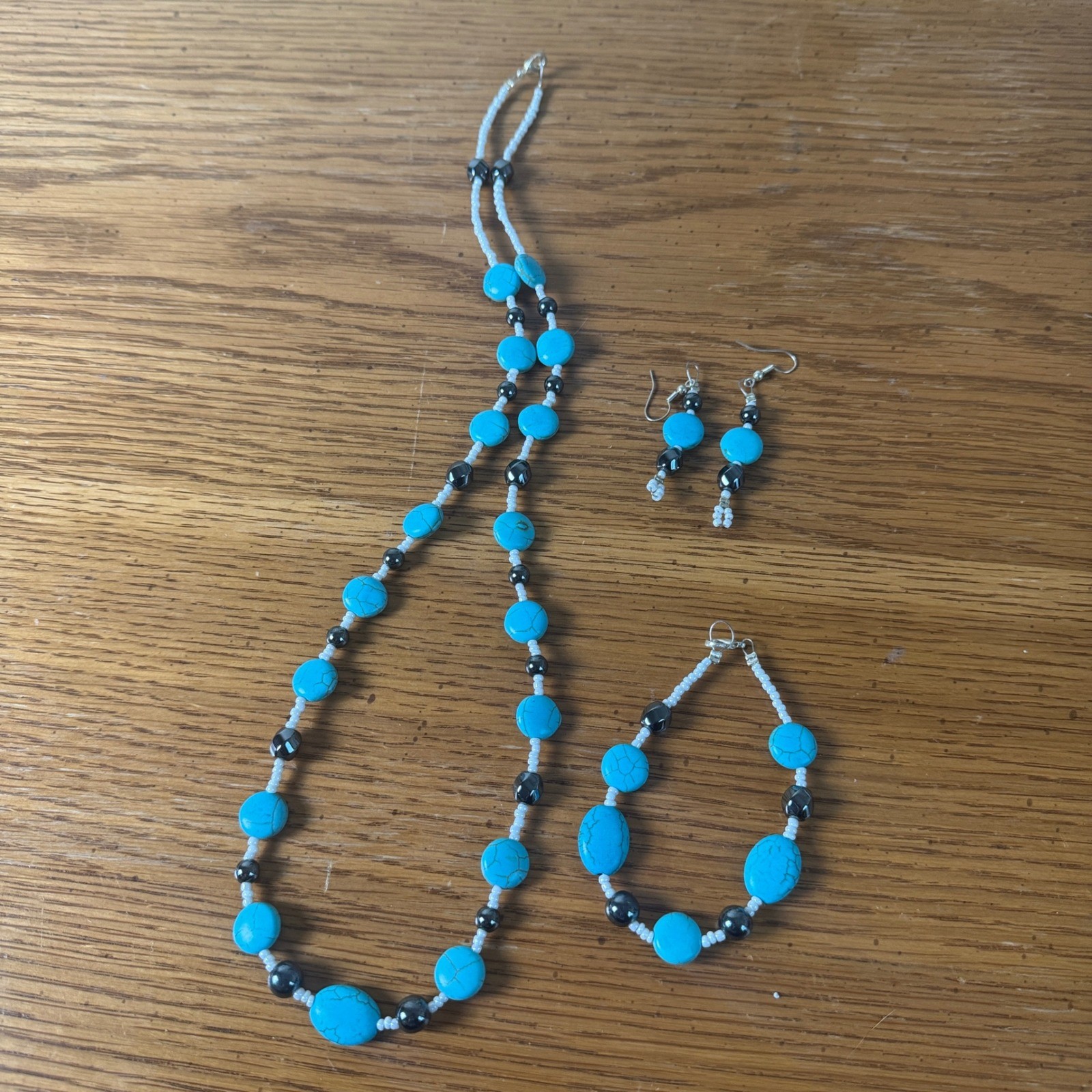 как выглядит Faux Turquoise Beaded Necklace Bracelet Earrings Set Silver Tone Accents фото