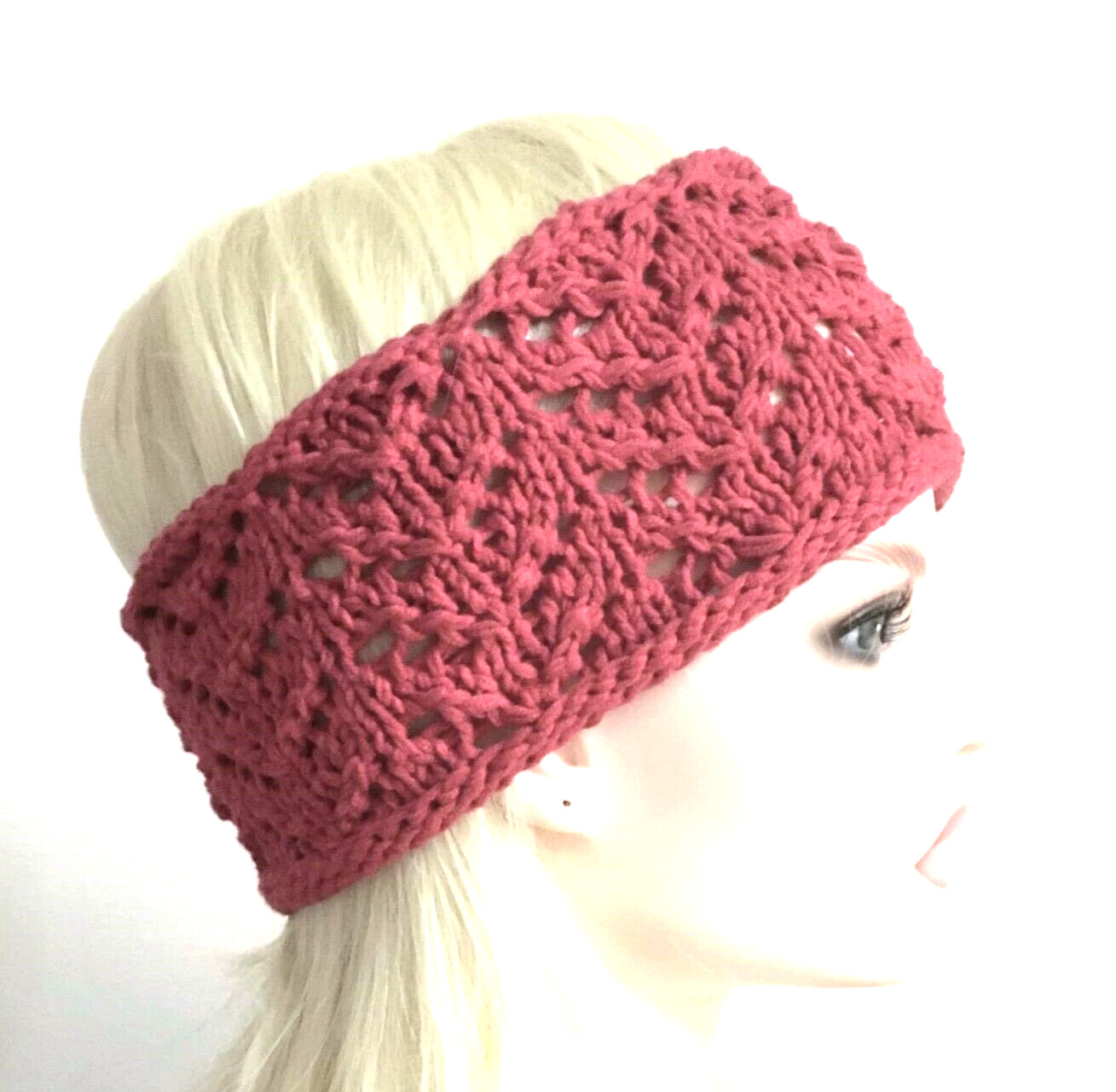 Pink Headband Ear Warmer New hand knitted Lace Pattern Cotton Blend