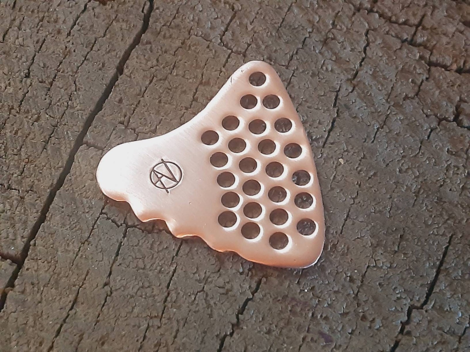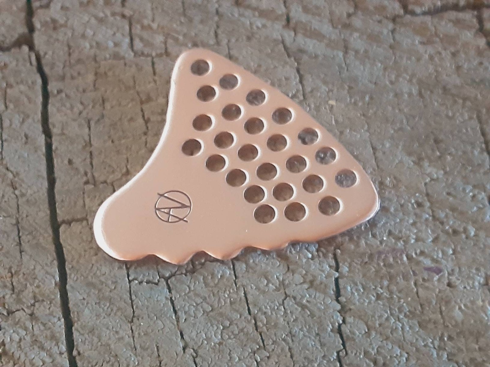 Handmade and playable copper guitar pick - shark tooth shape and holes to