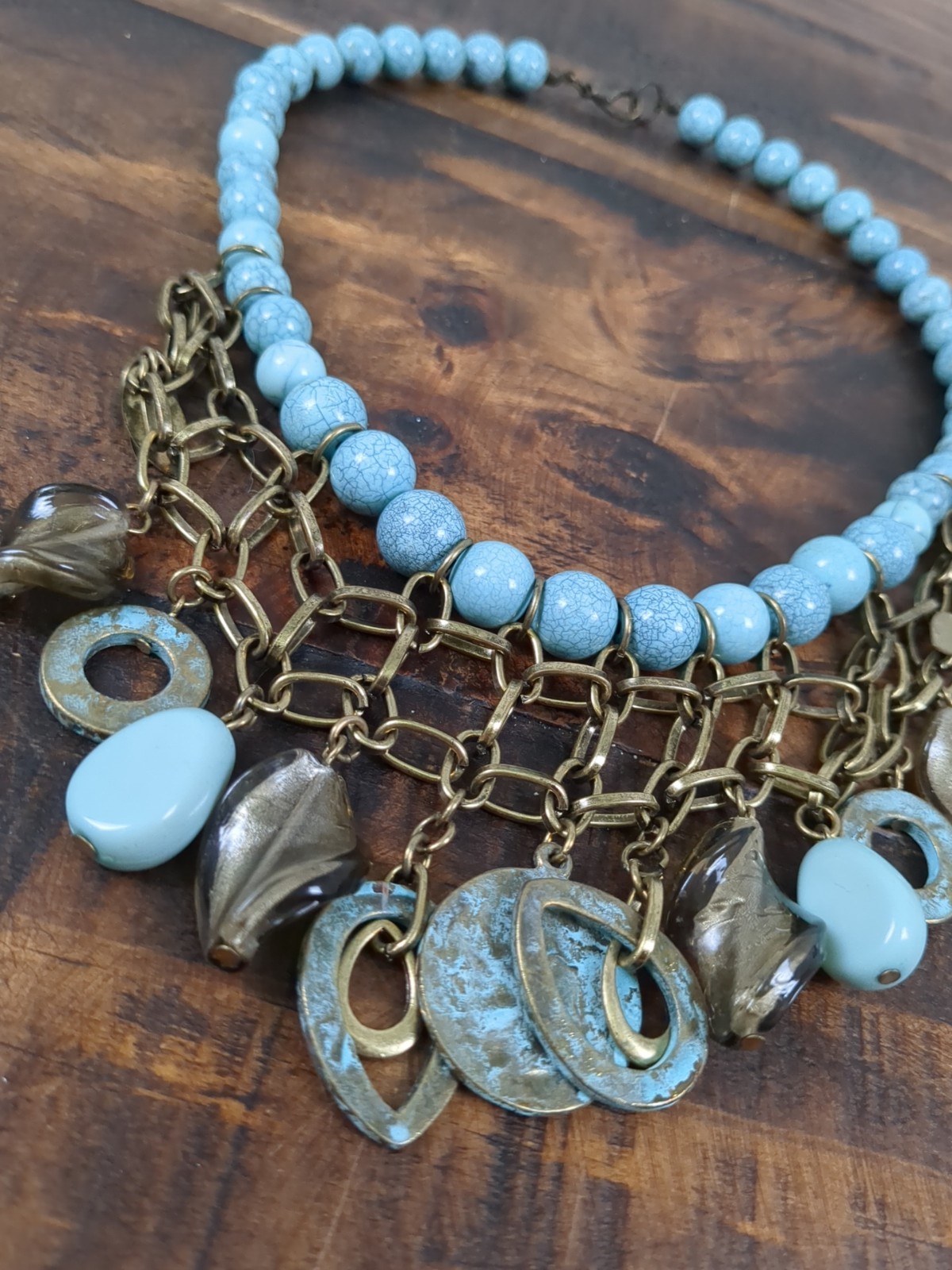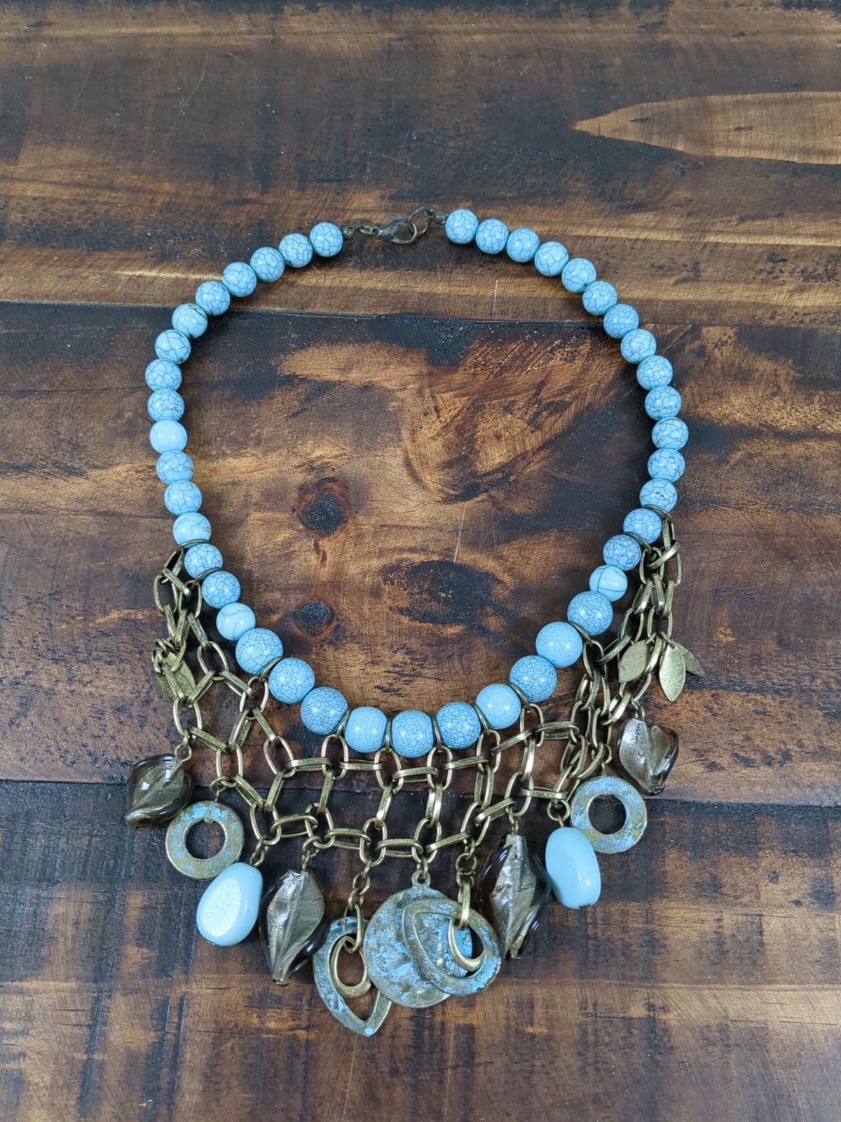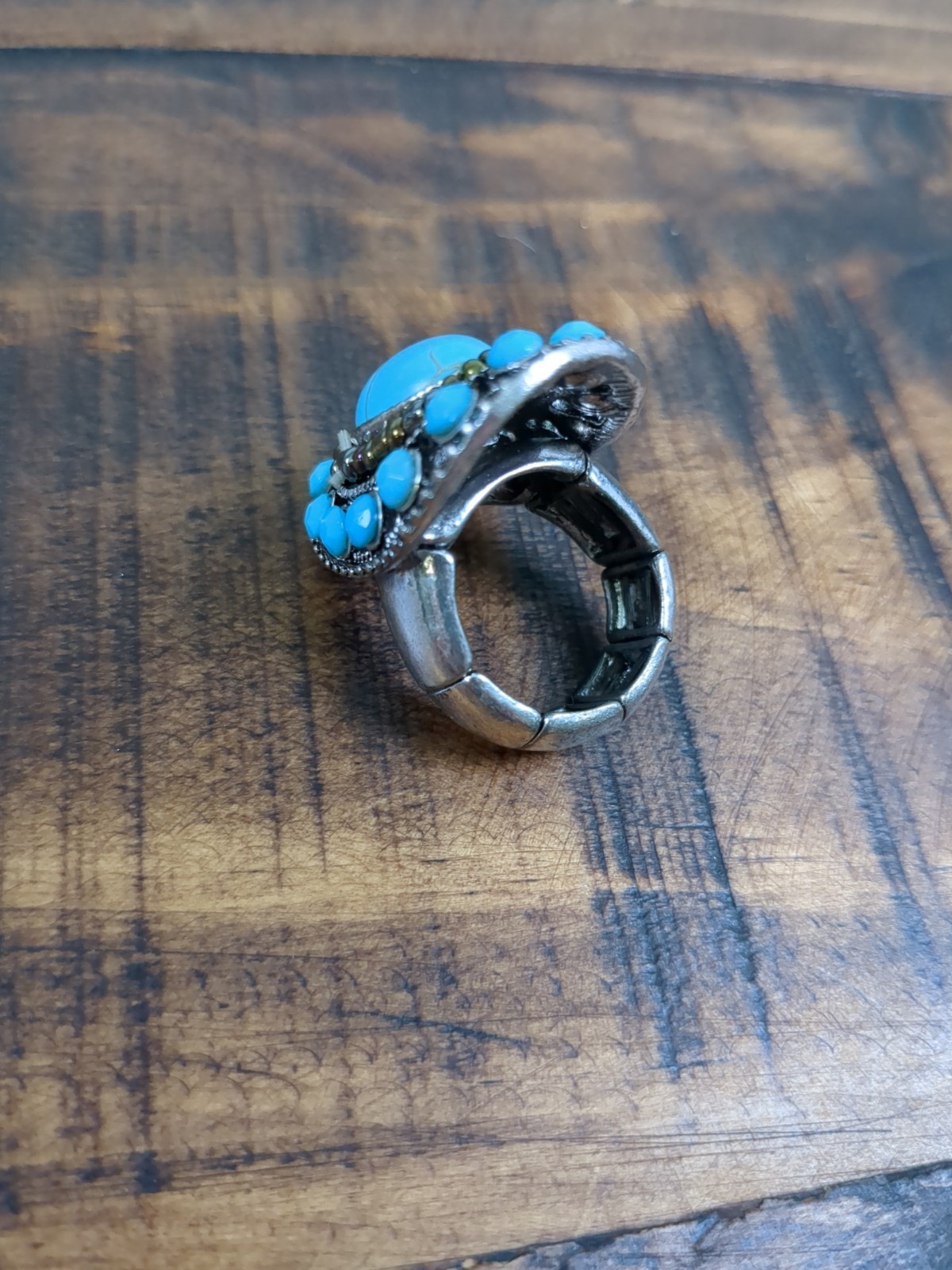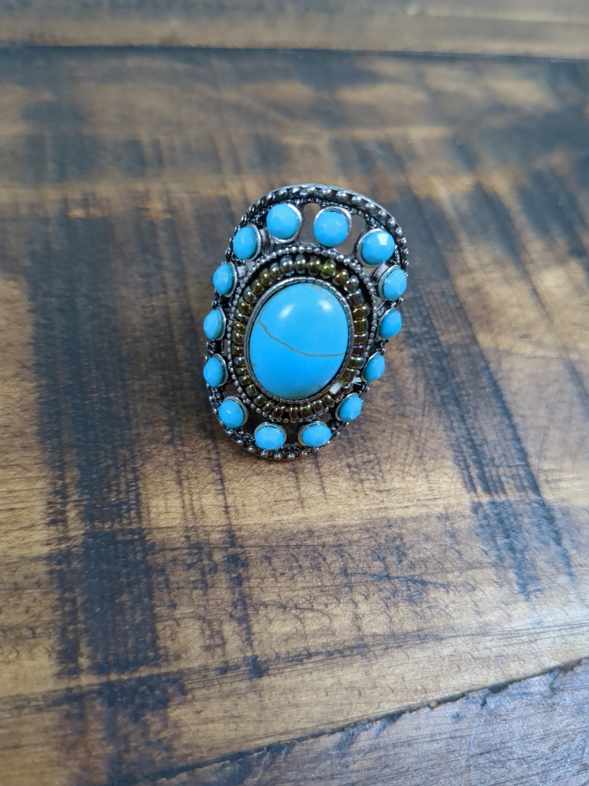 Faux Turquoise Jewelry Set, Adjustable Concho Ring, Earrings, Beaded Necklace