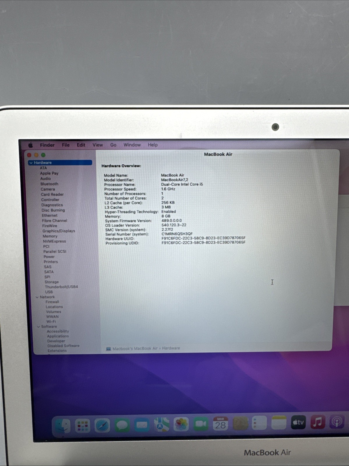 Apple MacBook Air A1466 2015 Dual Core i5 1.6GHz 8GB RAM 128GB SSD-BattCycle879