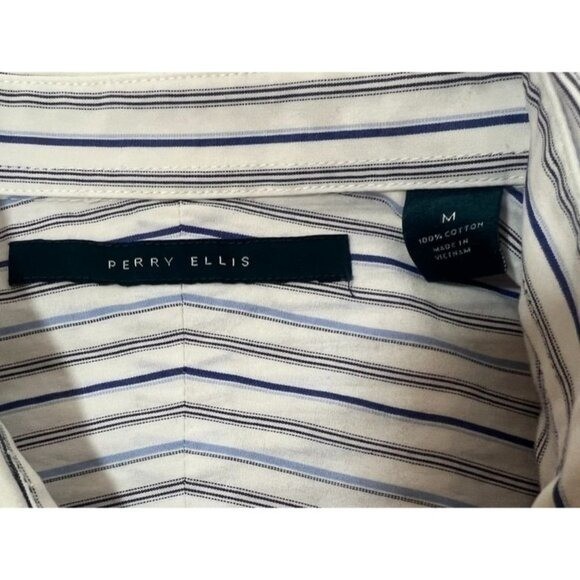 Perry Ellis Mens M LS Shirt Cotton Button Down Dress Blue White Striped