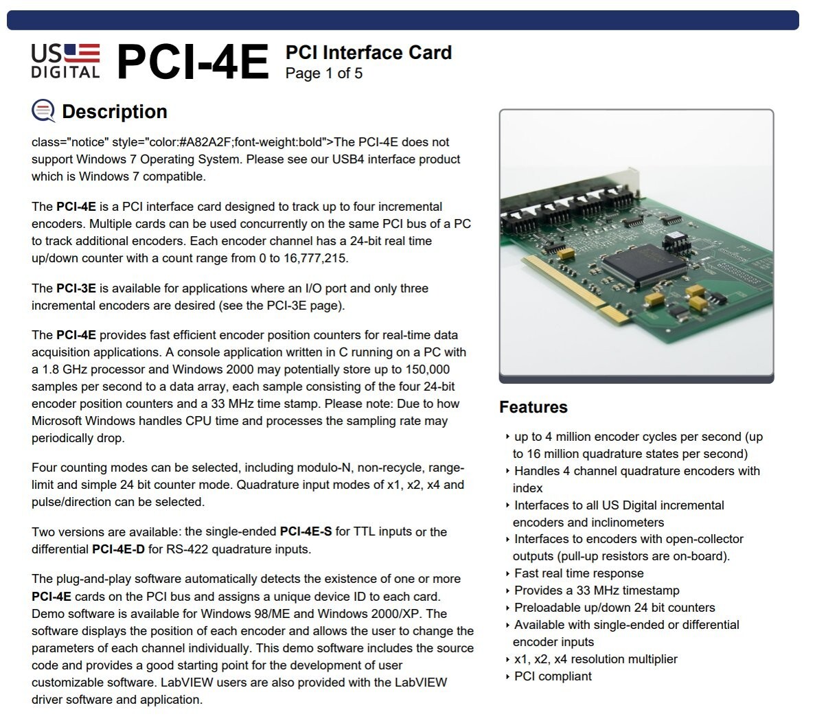 US Digital PCI-4E-S PC-Encoder PCI Interface Card Single Ended TTL Inputs