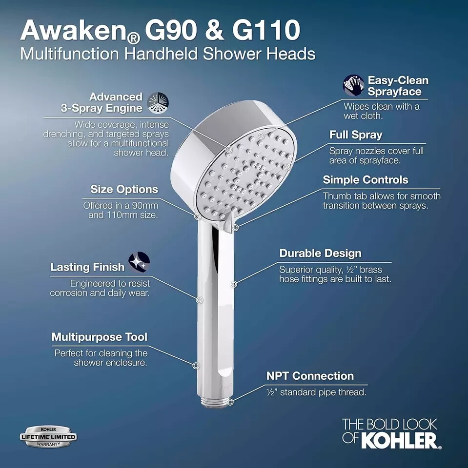 Kohler 72415-H-CP Awaken G110 3-Function Handshower Showerhead - Polished Chrome
