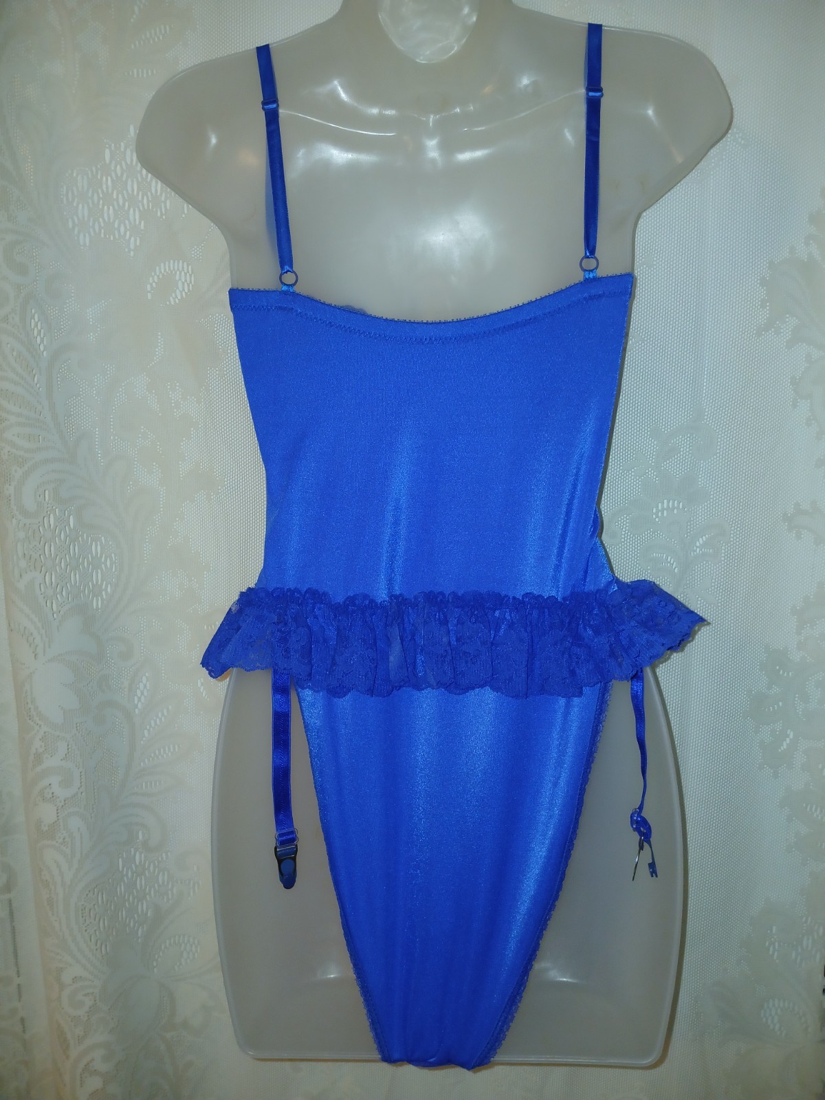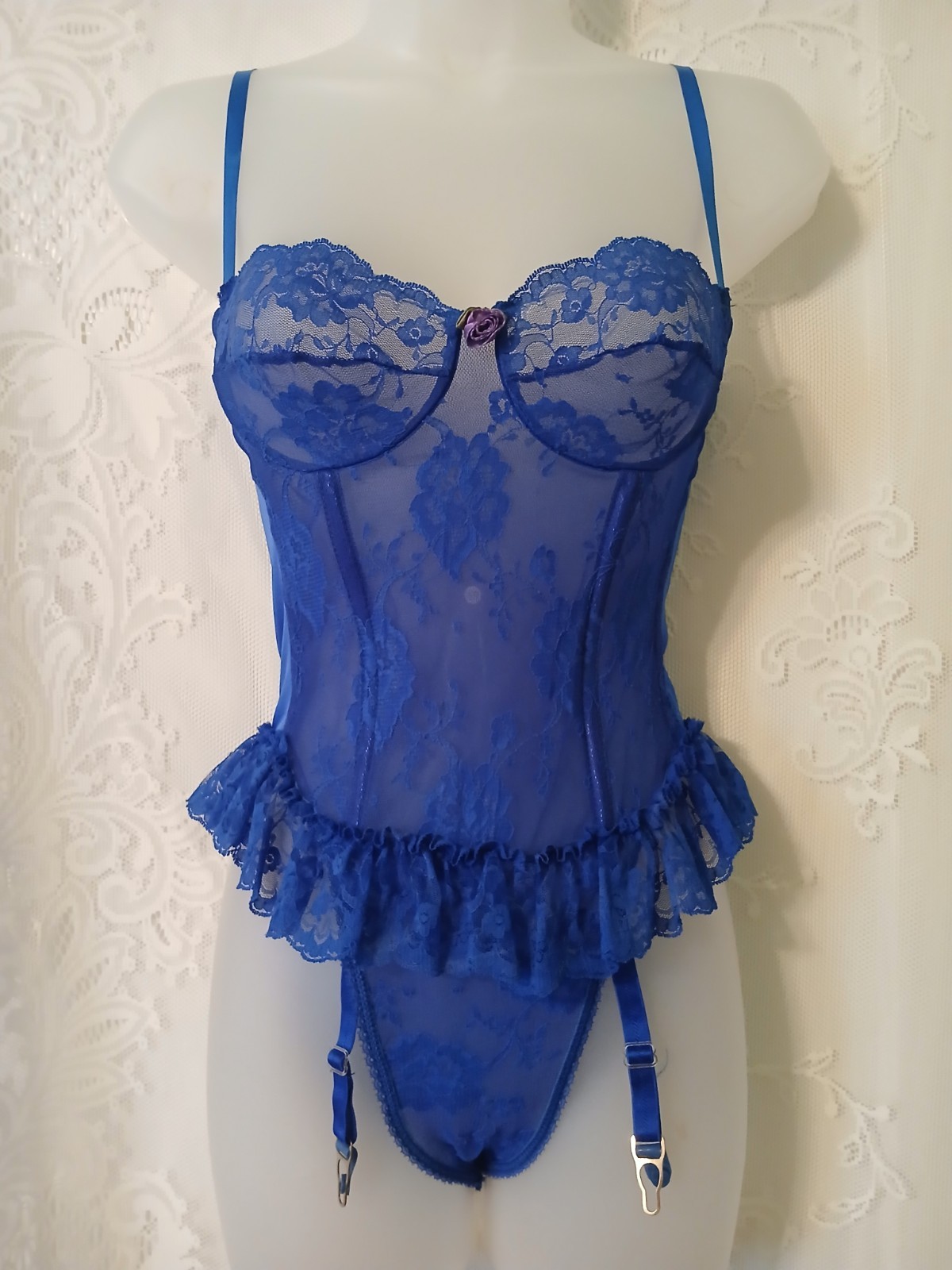 Vintage Shirley Of Hollywood Blue Floral Lace Hi-Cut Teddy Lingerie Garters M