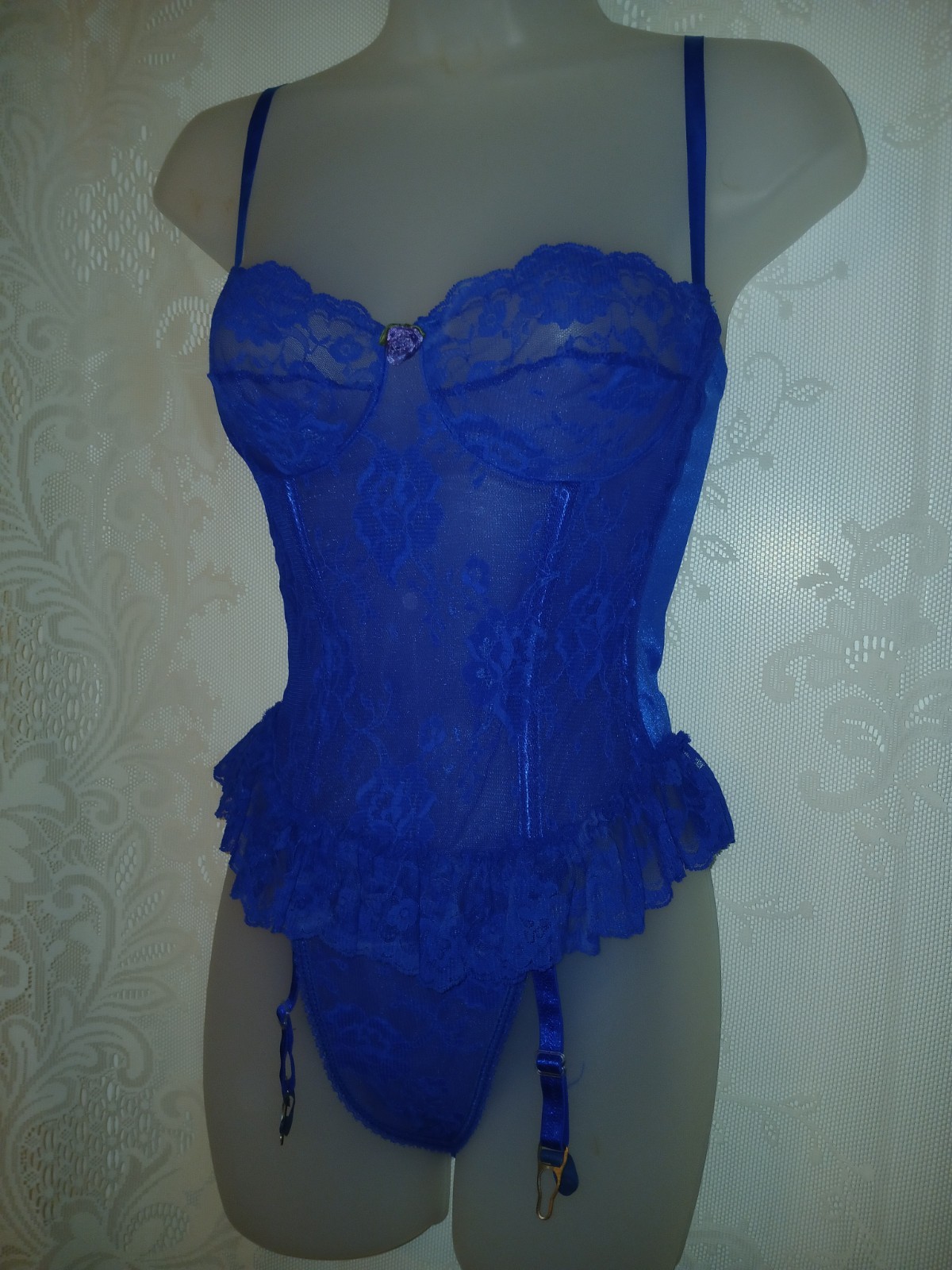 как выглядит Vintage Shirley Of Hollywood Blue Floral Lace Hi-Cut Teddy Lingerie Garters M фото