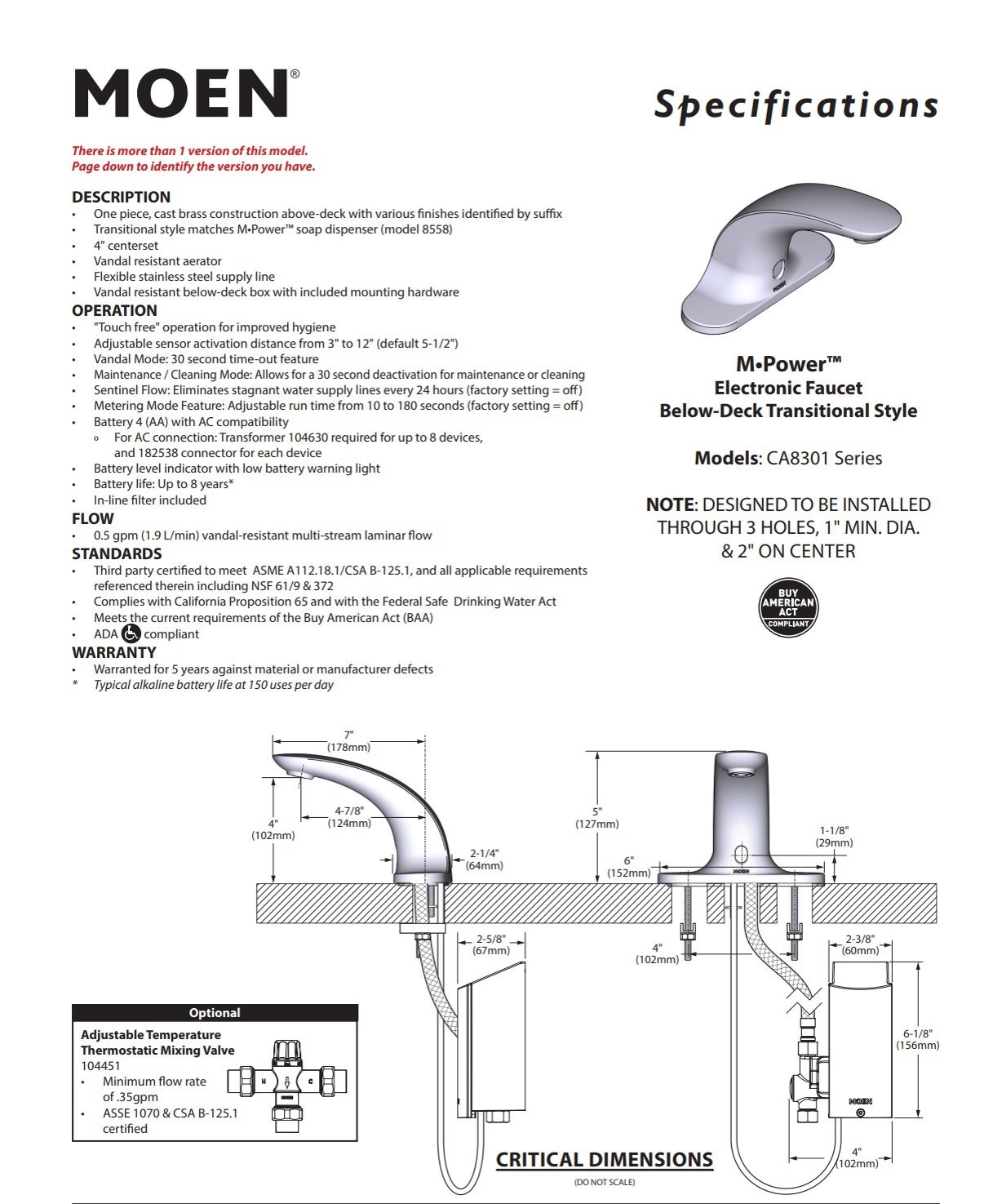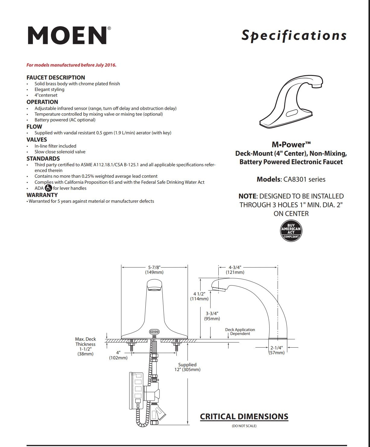MOEN COMMERCIAL CA8301 M-POWER Chrome Touchless Sensor-Operated Bathroom Faucet