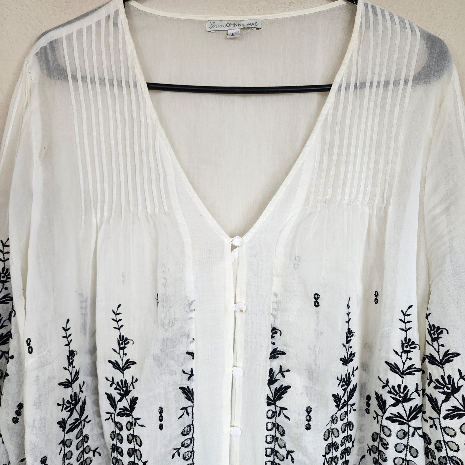 Johnny Was Silk Embroidered Long Sleeve Sheer Boho Blouse
