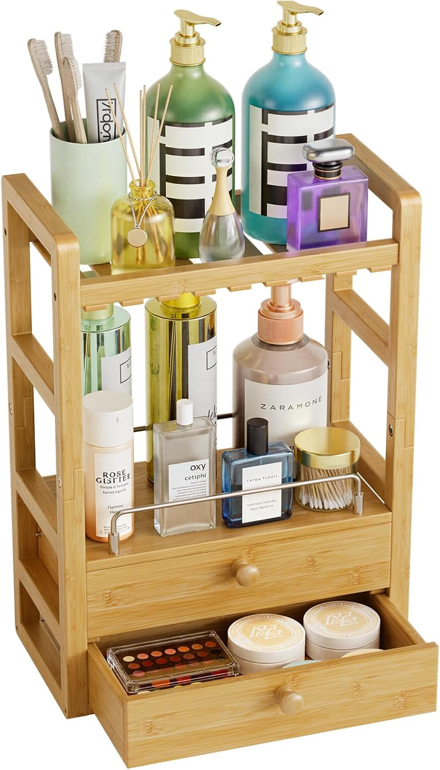 Bamboo Bathroom Countertop Organizer, 2-Tier Makeup Organizer with 2 Drawers, Va