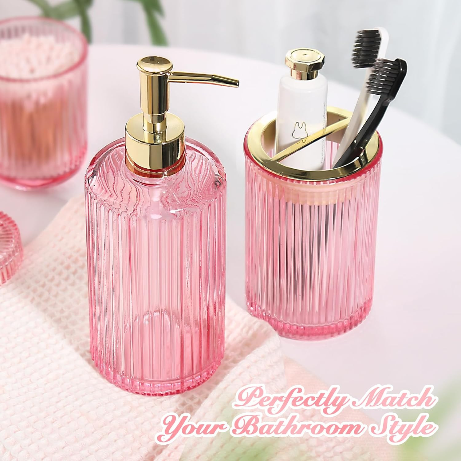 Included Components: Cotton Ball Holder, Qtip Holder, Soap Dispenser, Toothbrush Holde