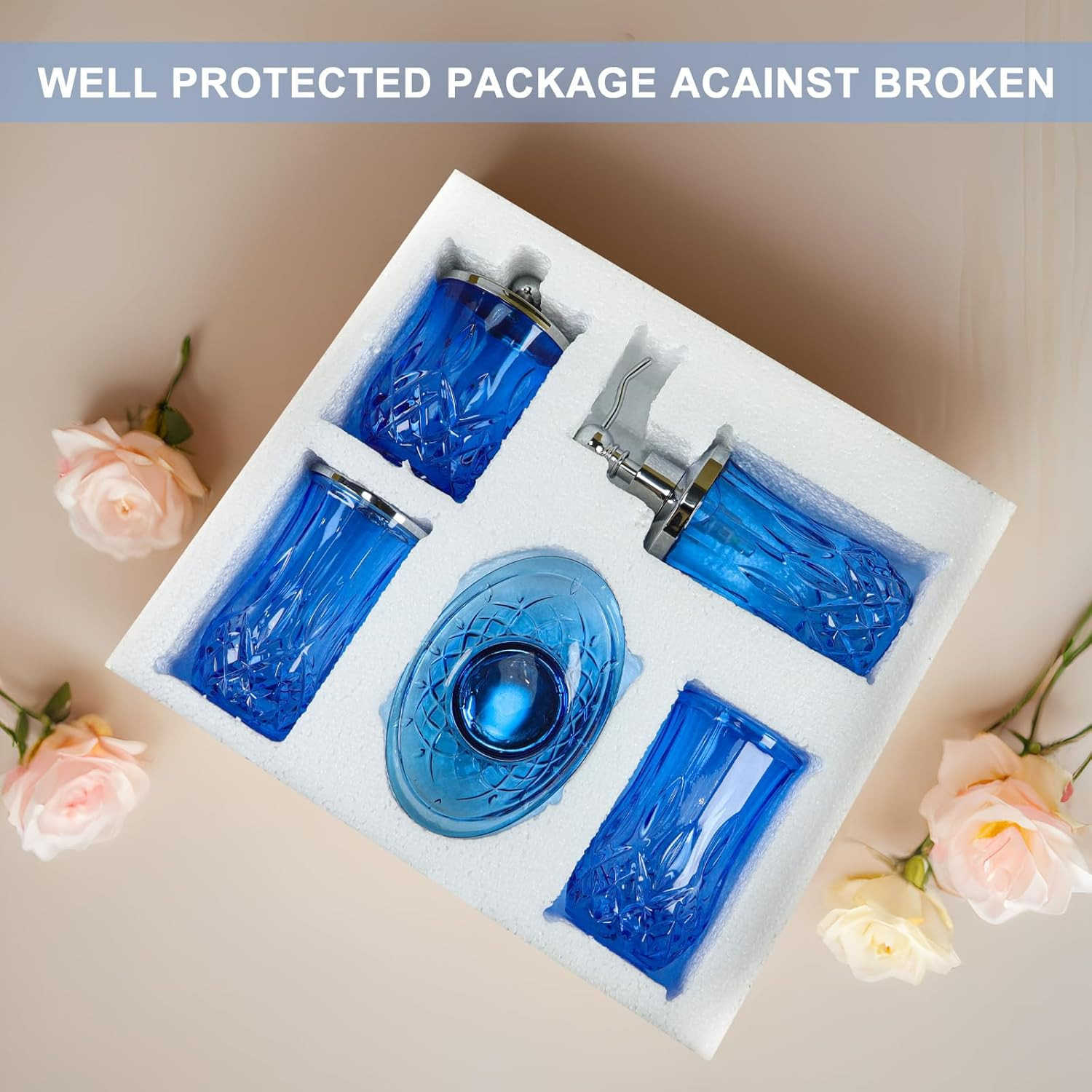 Bathroom Accessories Set,5 Pcs Blue Glass Bathroom Accessory Set,Complete Lotion