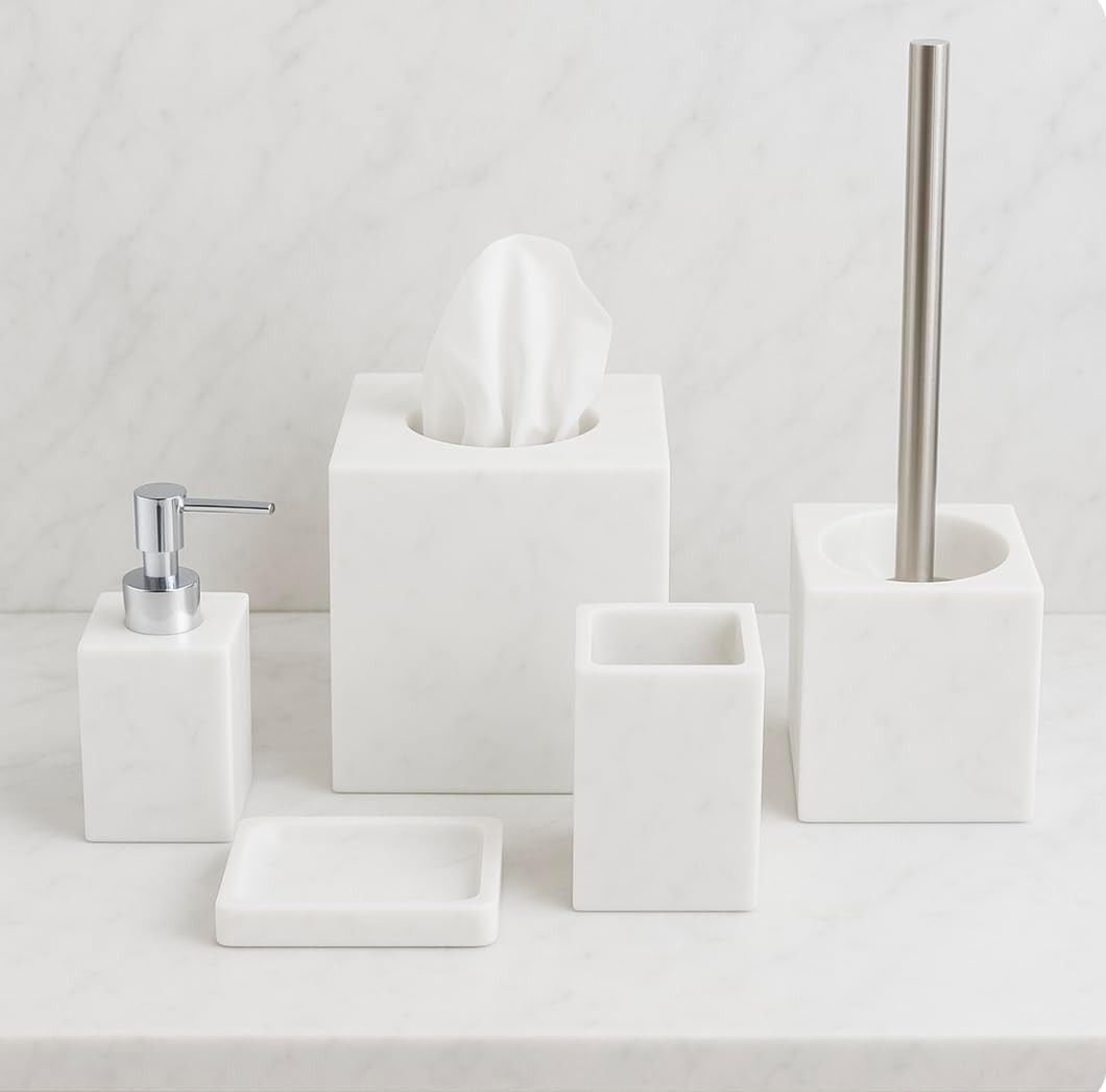 5 Piece Bathroom Accessories Set Complete Faux Marble and White Bathroom Acces
