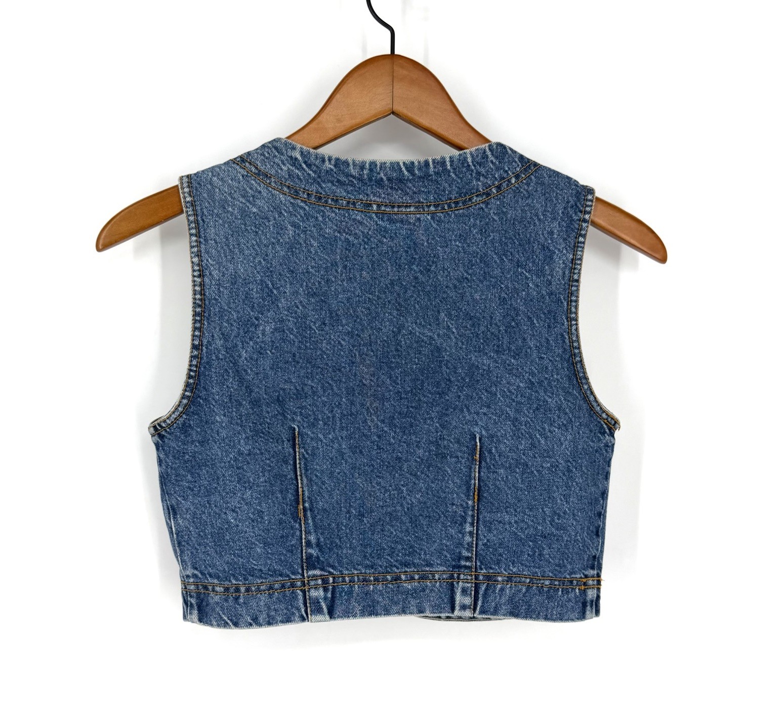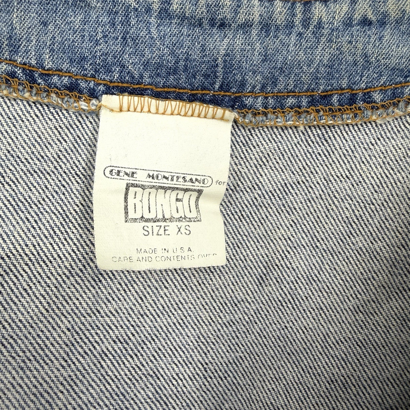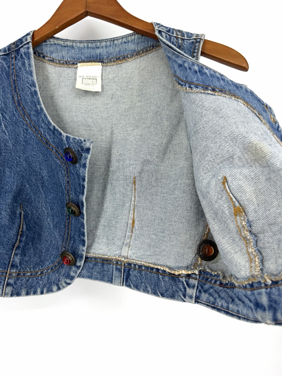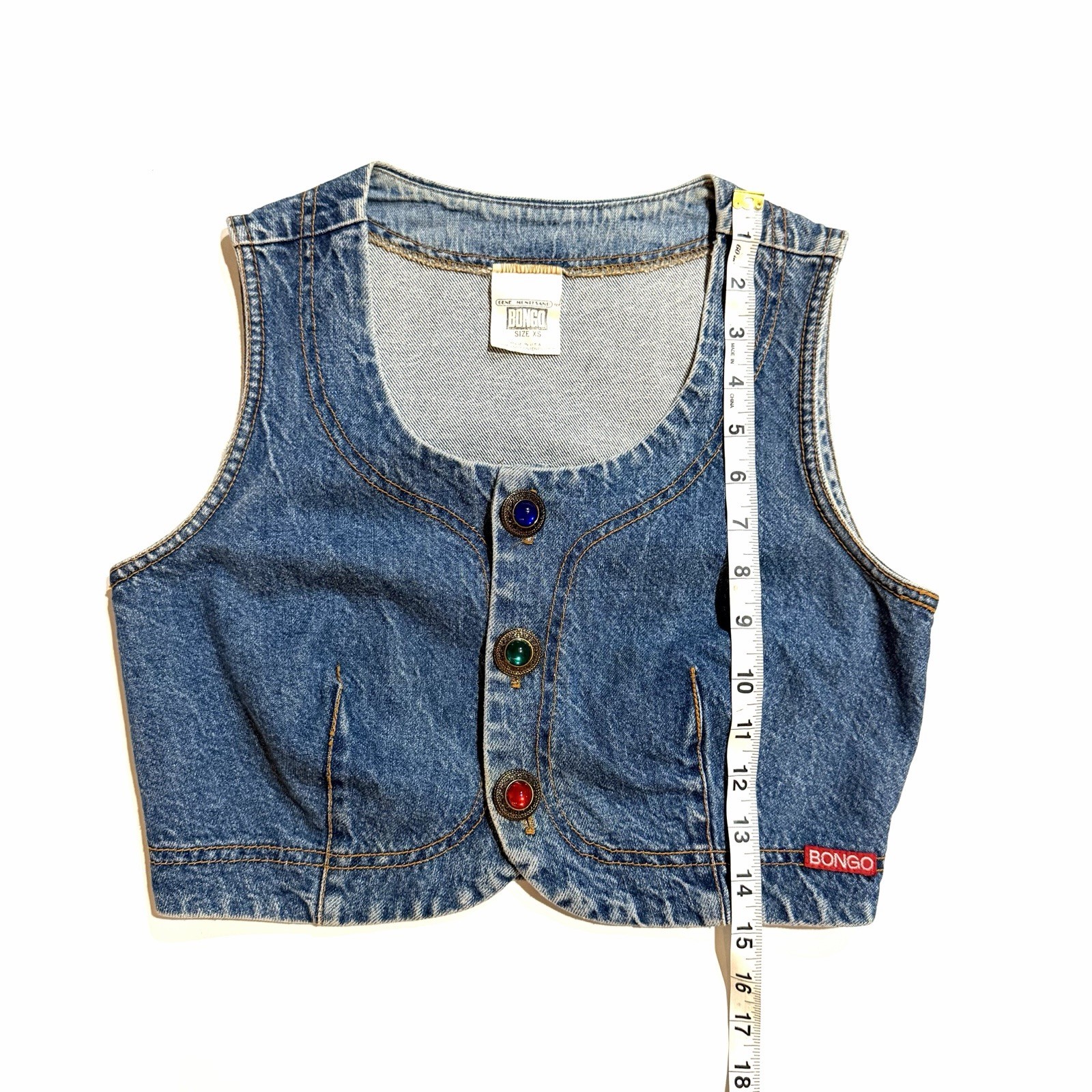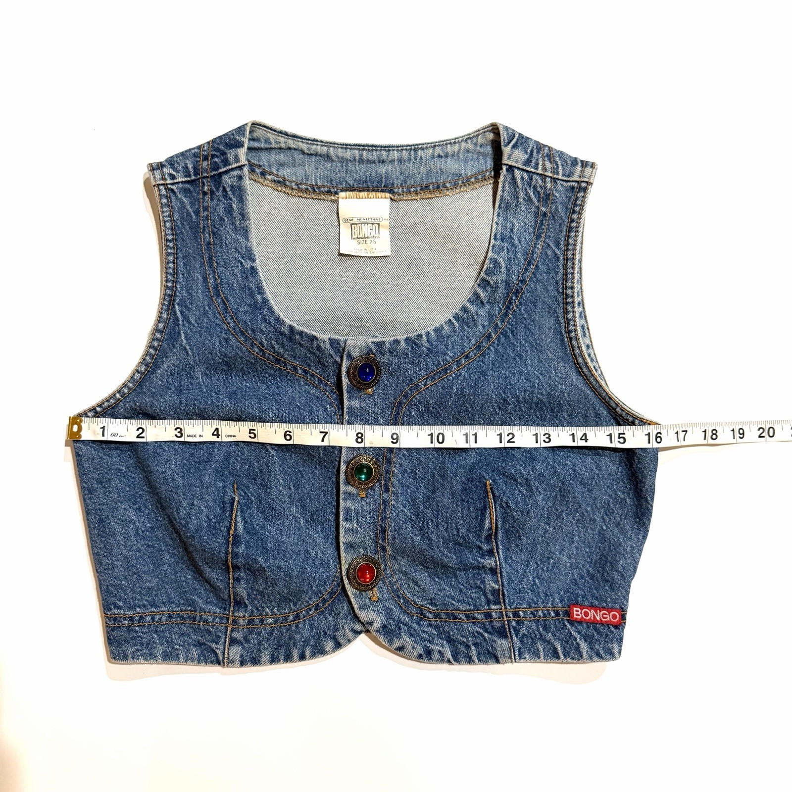 Vtg 90s Crop Denim Vest Top XS Bongo Montesano Blue Jewel Button Rodeo Festival