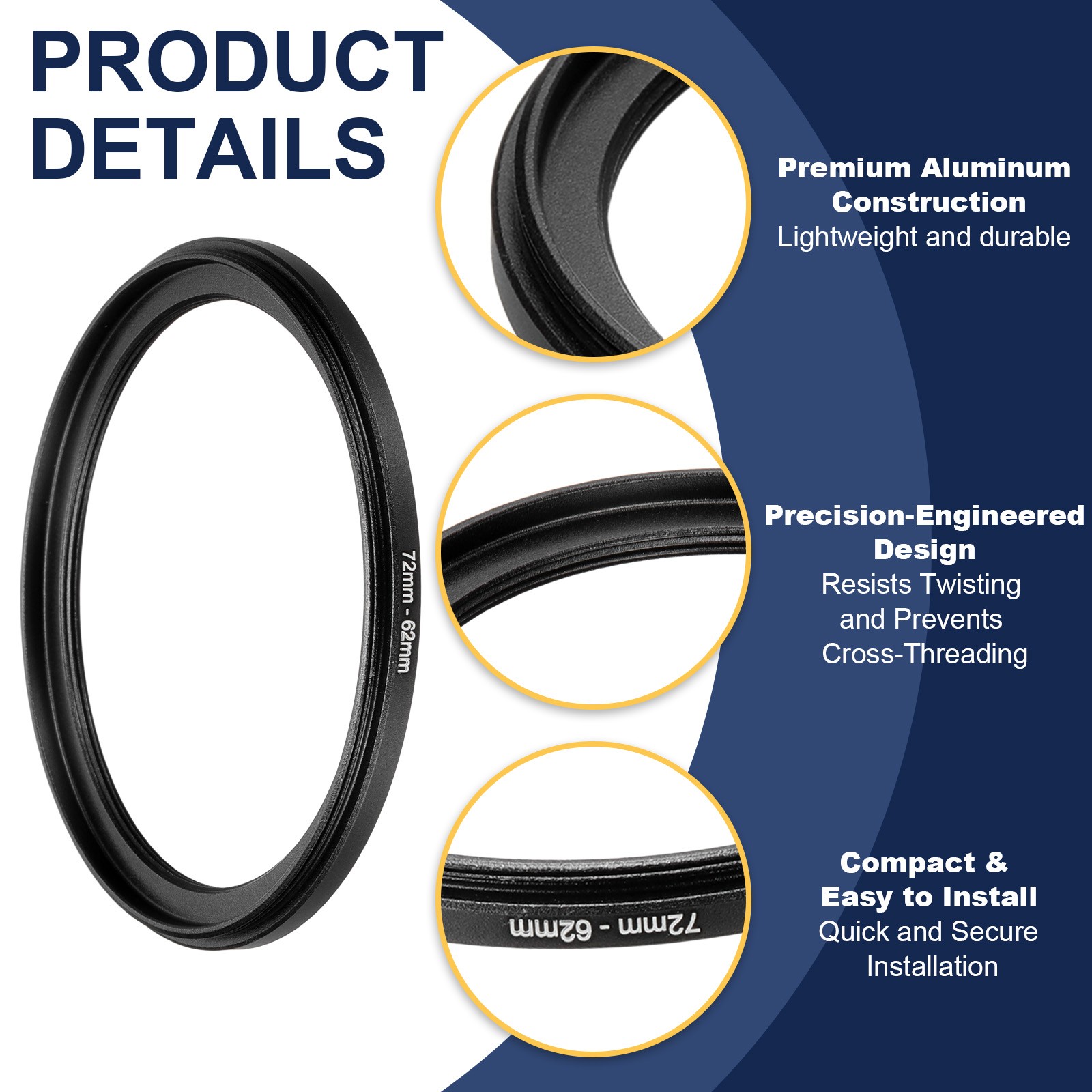 72mm Male 62mm Female Step Down Ring Adapter for ND IR DSLR Lenses, Black