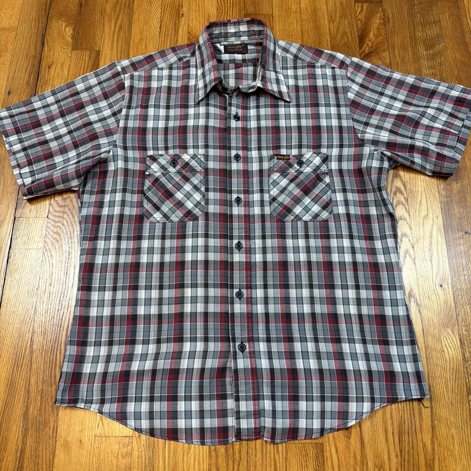 Vintage 70s Wrangler Western Shirt Mens L Cotton Blend Made in USA Gray Plaid