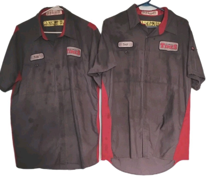 как выглядит Lot Of 4 Red Kap Work Shirt Large Mechanic Uniform Red Gray Short Sleeve фото