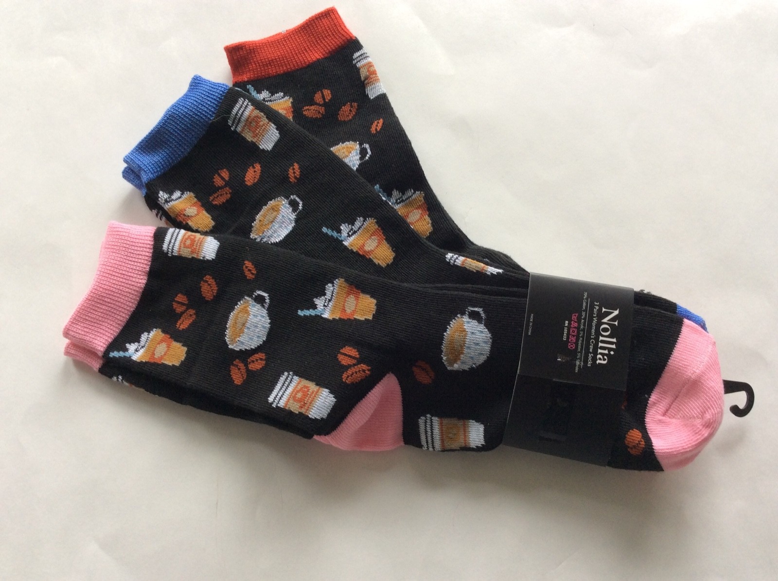 как выглядит 3 PAIRS WOMENS NOVELTY COFFEE/LATTE CREW SOCKS BLACK W/ PURPLE/PINK/RED NWL фото