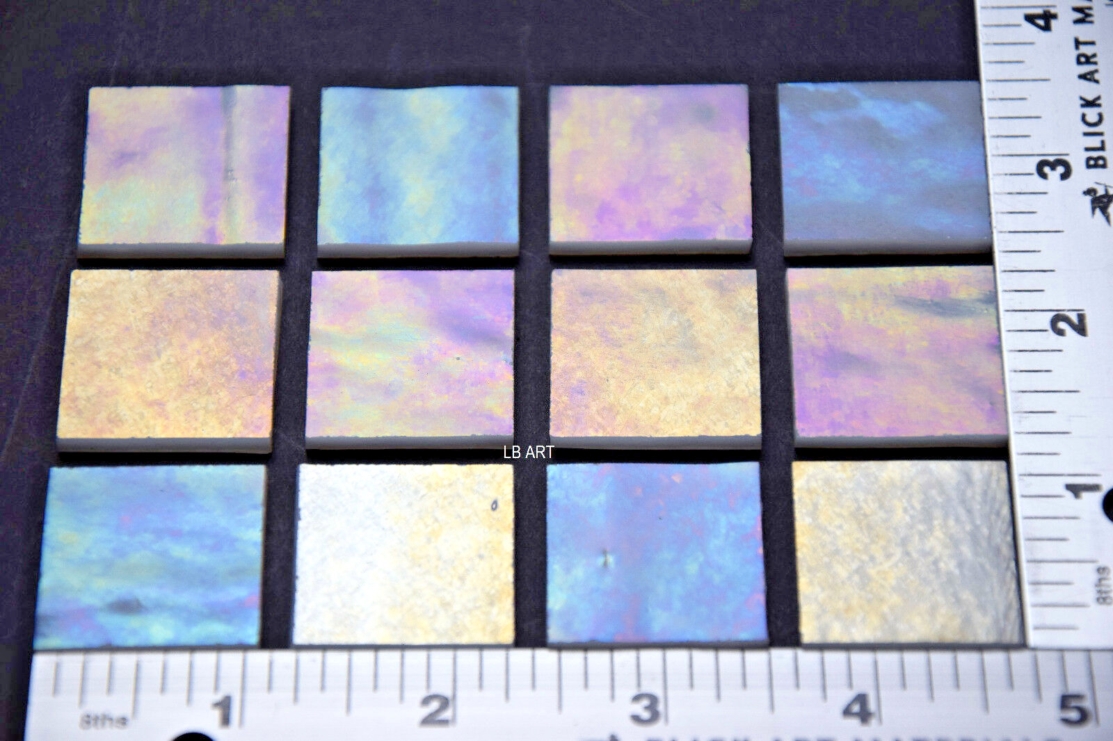 как выглядит 0113.31- 12 PIECES OF IRIDIZED OPAQUE WHITE 1"x 1" 3mm BULLSEYE GLASS 90 COE фото