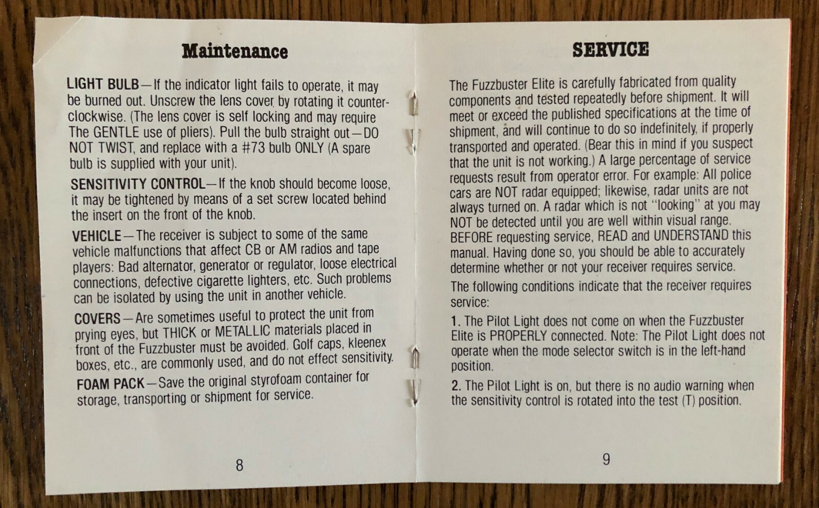 Vintage 1980 Fuzzbuster Elite Radar Detector Operator's Manual Excellent Cond.