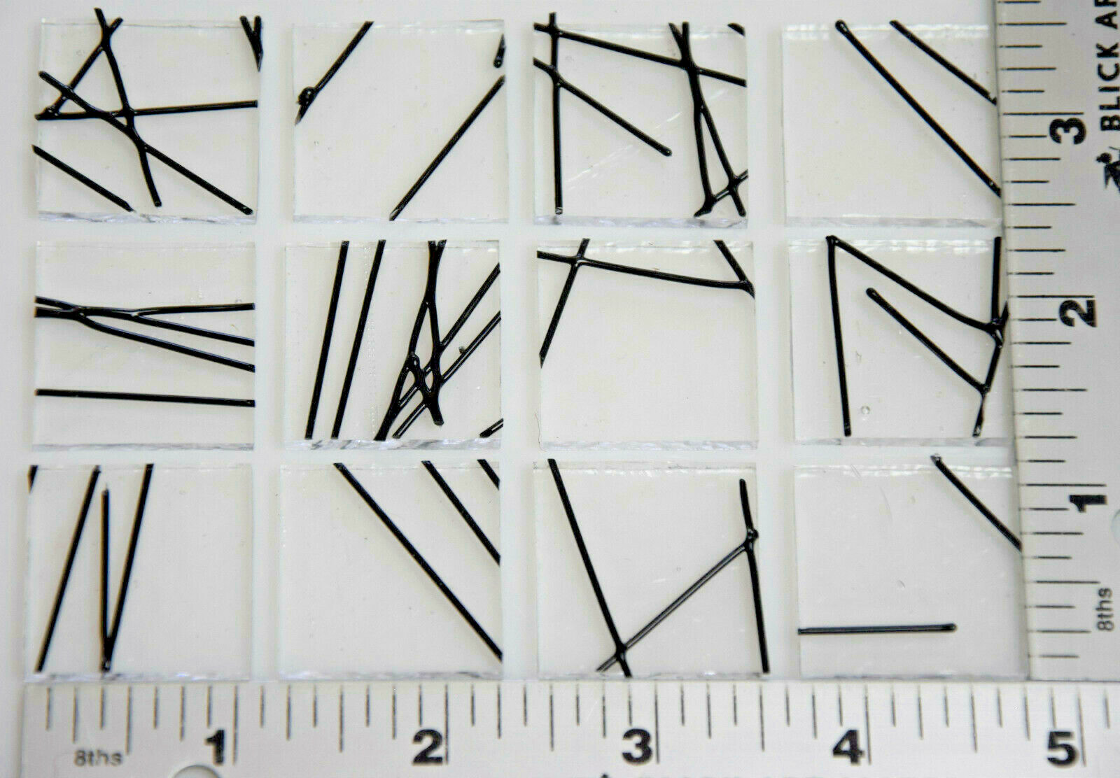 как выглядит 4400.30 -12 pcs-1"x 1" BLACK CHOPSTIX TEXTURE ON CLEAR 3mm BULLSEYE GLASS 90 COE фото