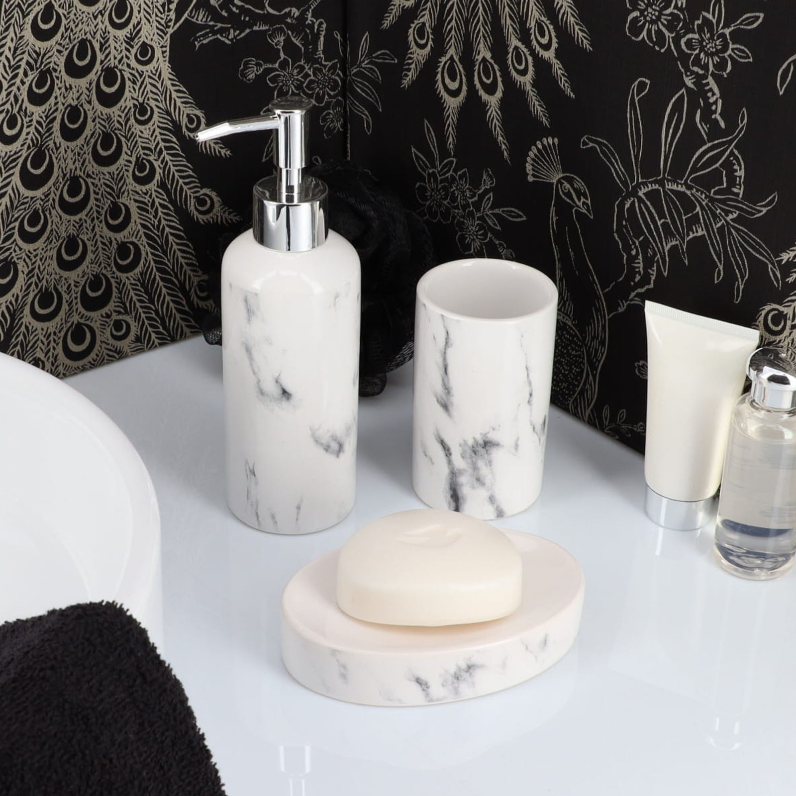 как выглядит Marble Bath Set Accessories Tumbler lotion soap dispenser soap dish Toilet Brush фото