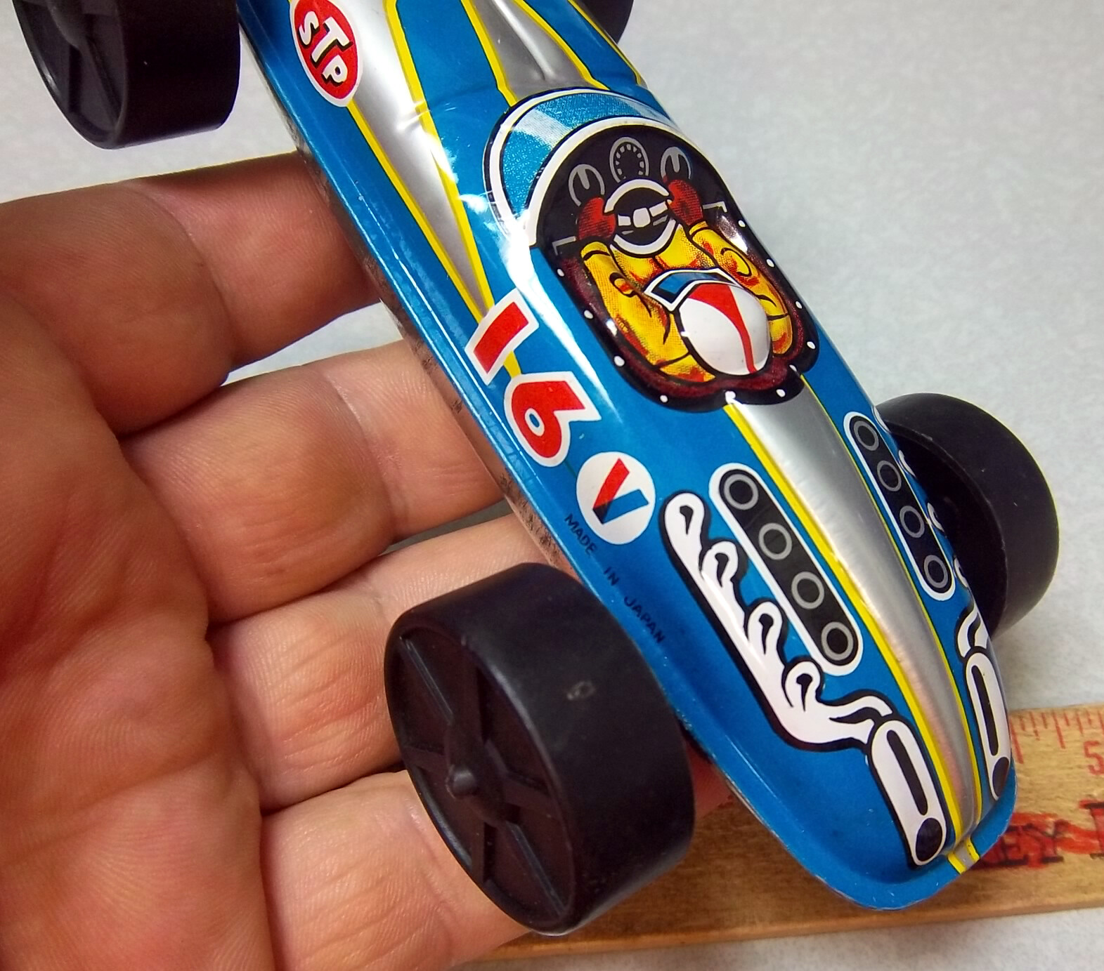 vintage 1960s tin lithographed race car, 6.5 in Long, plastic wheels, STP logo