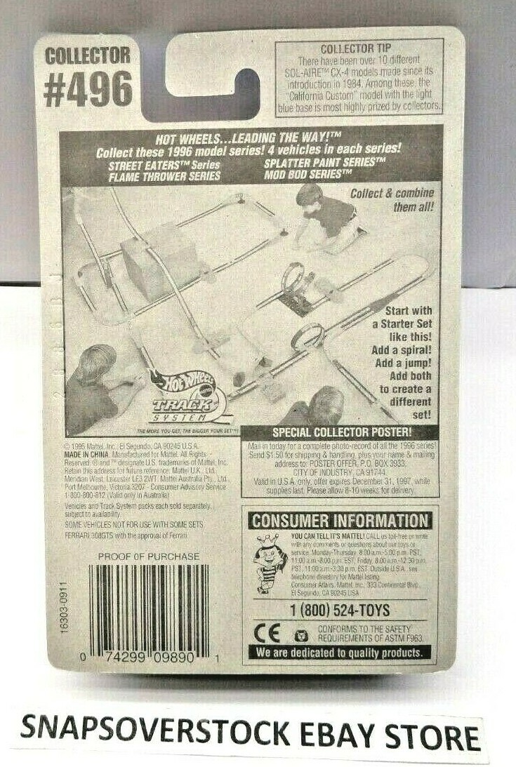 Особенности: SNAPSOVERSTOCK EBAY STORE, HOT WHEELS LISTING, UN-OPENED FACTORY SEALED 1996 HOT WHEELS PACKAGE, 1996 HOT WHEELS #496 CHROME 5-SPOKE RIM VARIATION