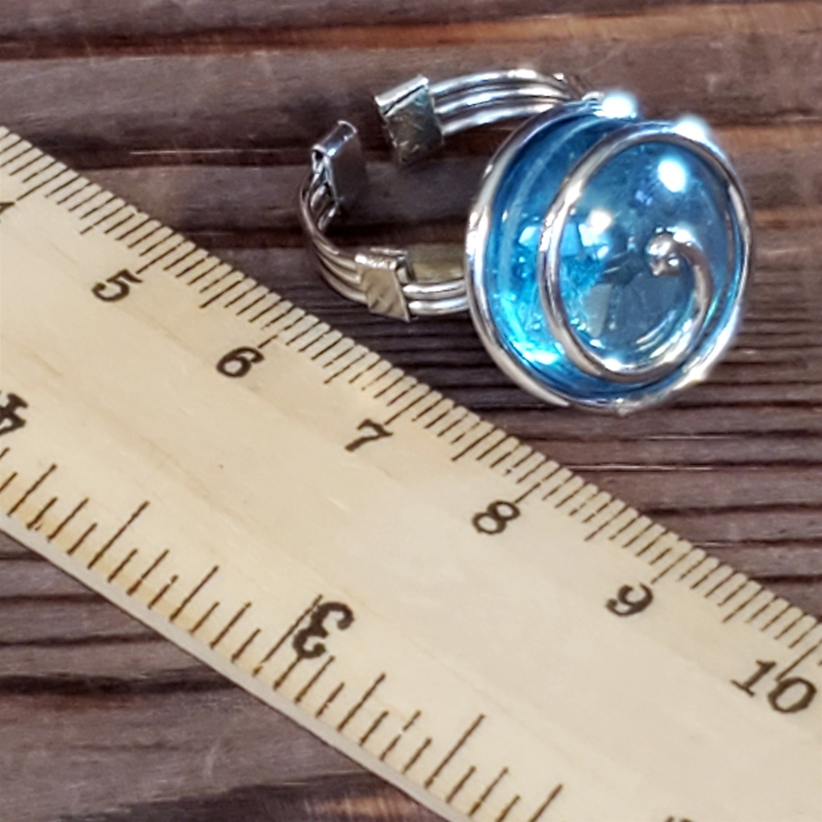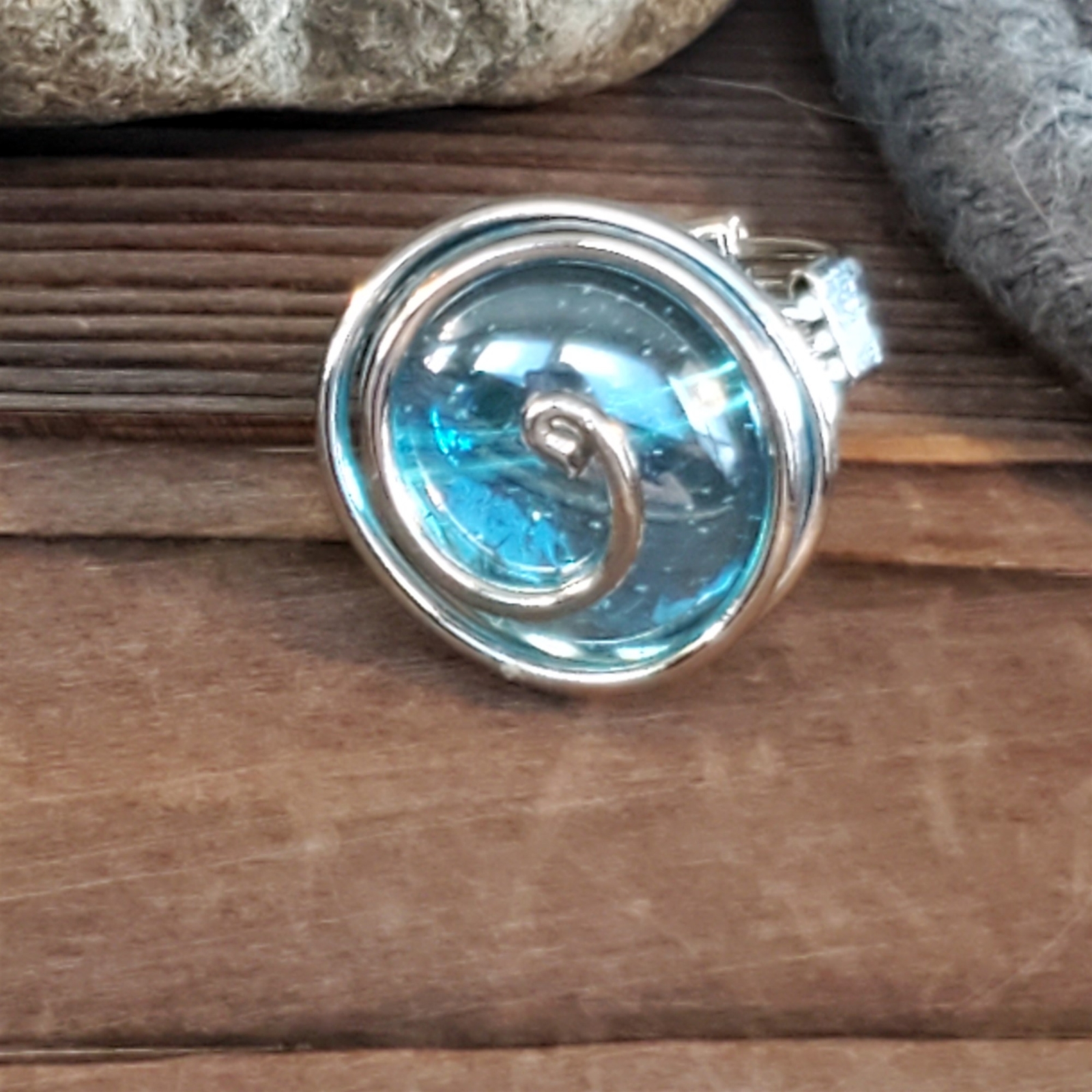 как выглядит Handcrafted Edgy Turquoise Blue Luster Silver Spiral Luster Glass Bauble Ring фото