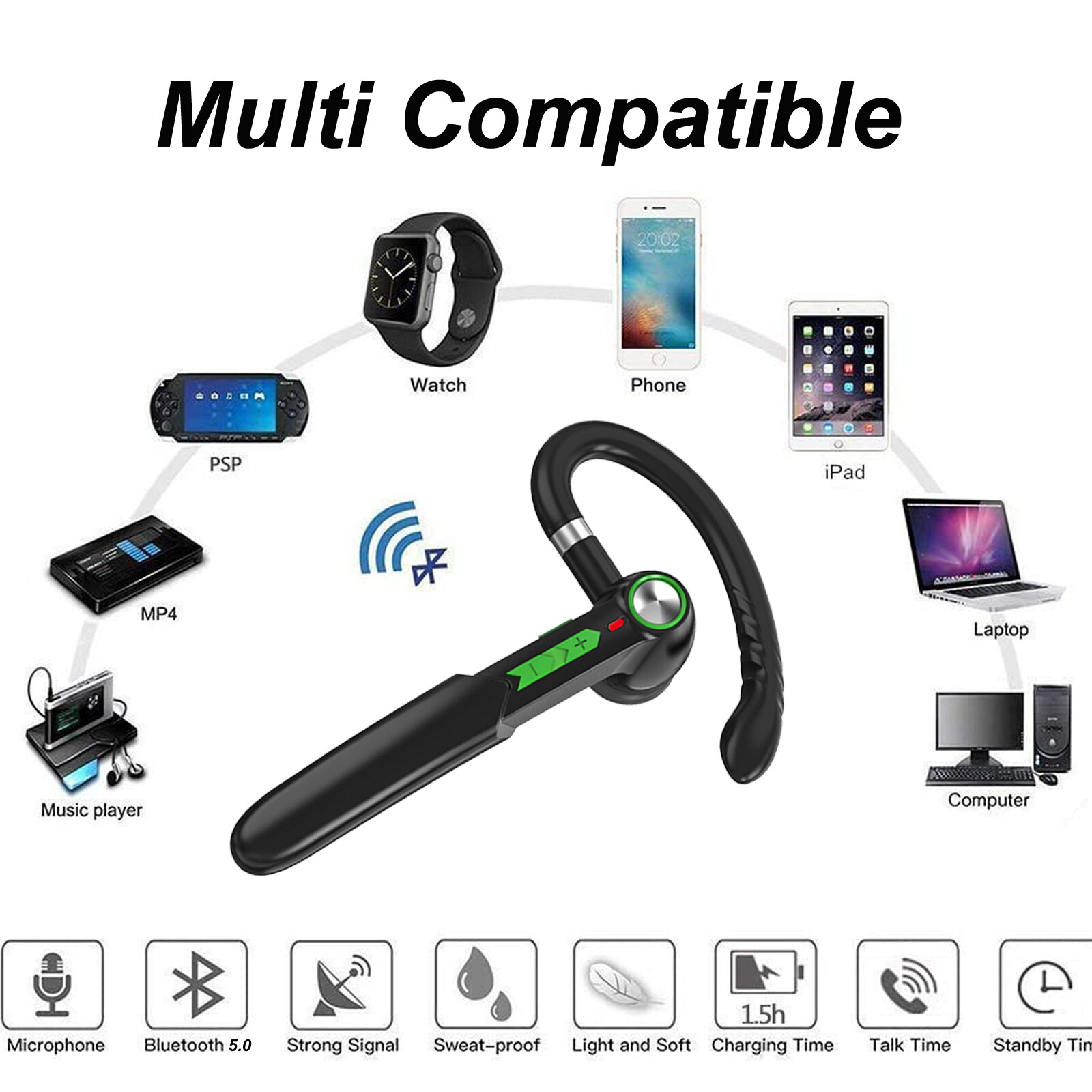 Особенности: Built-In On/Off Switch, Built-in Microphone, Noise Cancellation, Fit for Right or Left Ear, Stereo, Lightweight, Portable, Call functions, Rechargeable Battery