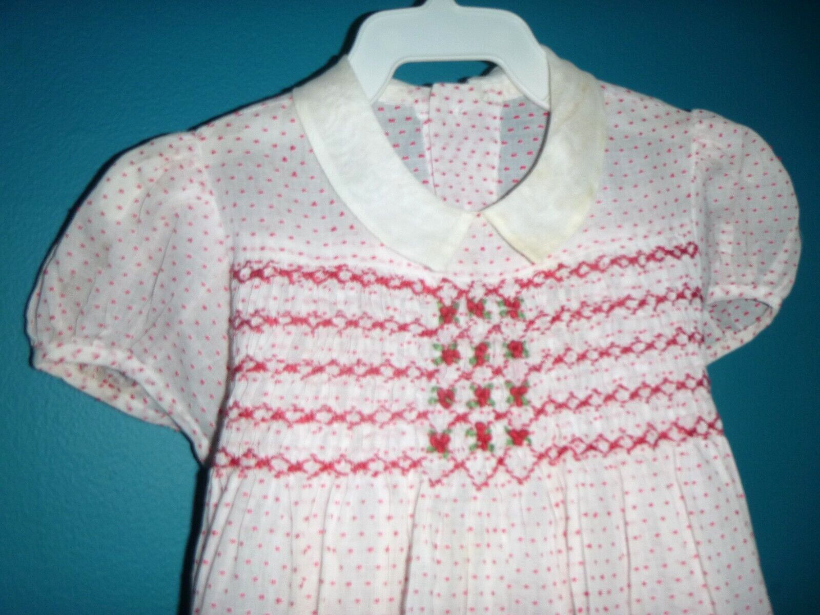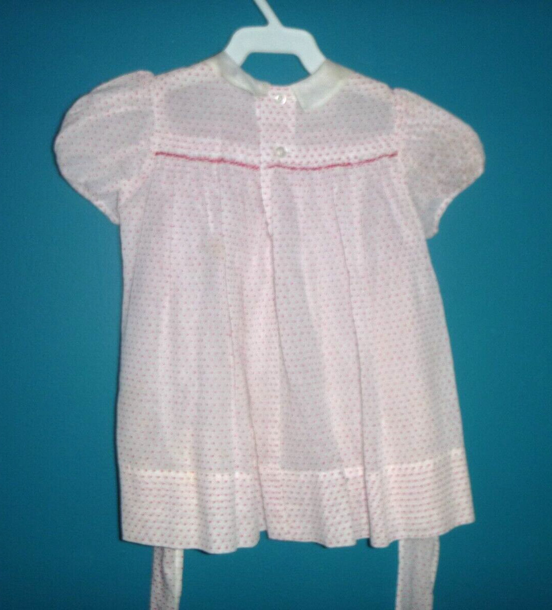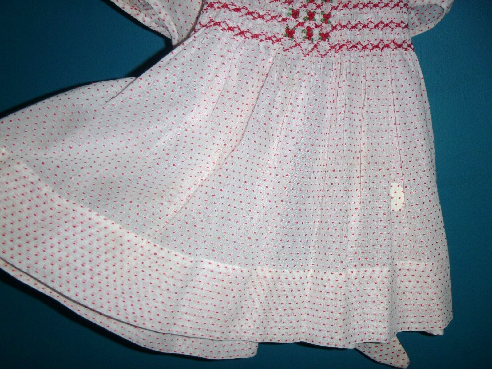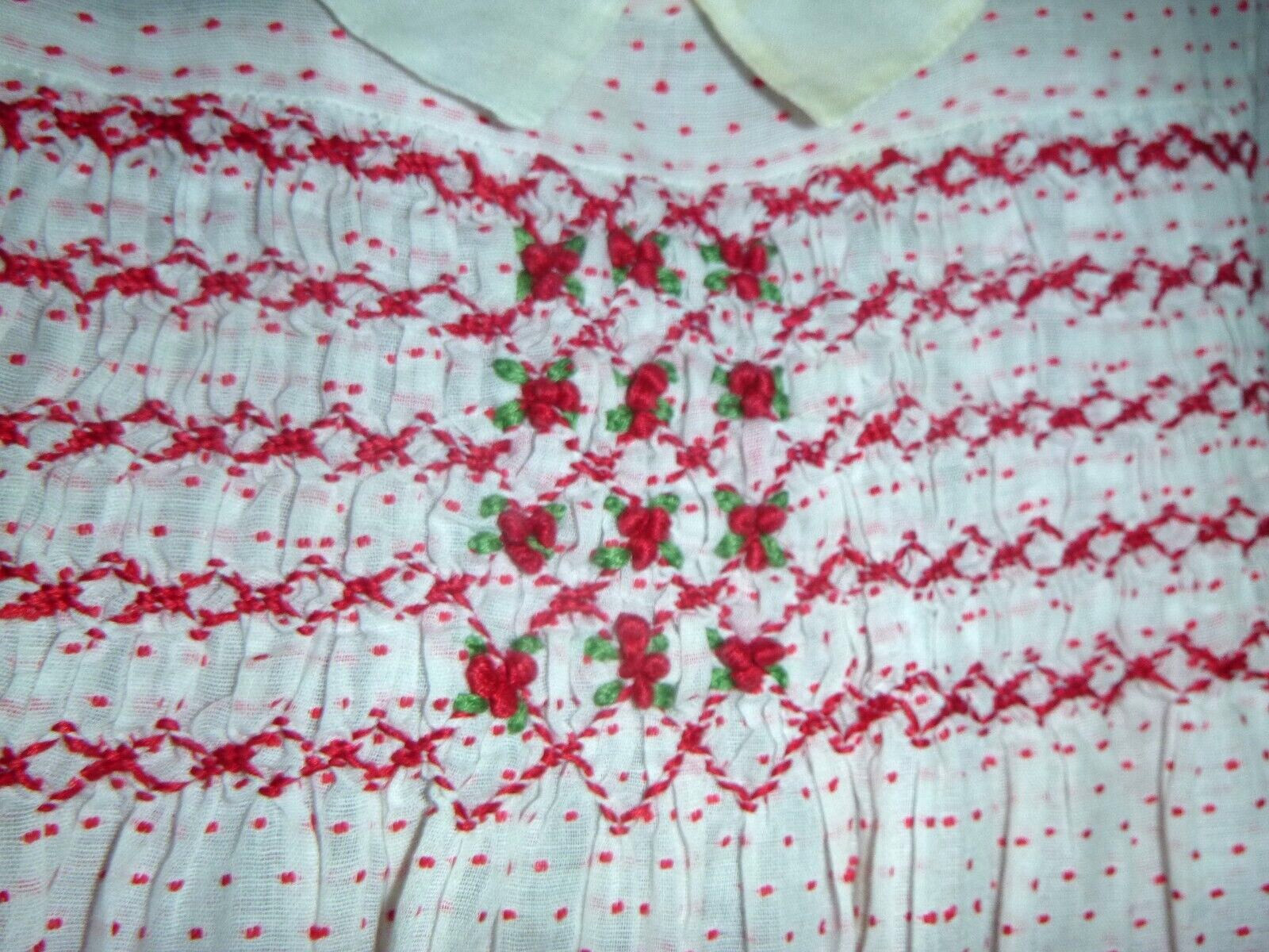 Vtg 50s Sheer Cotton Dotted Swiss Dots Dress Red White Smocked Bodice Sz 18 mo