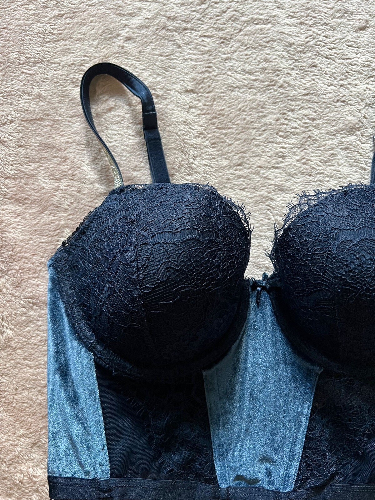как выглядит Victorias Secret Navy 34D Dream Angels Lace Velvet Shine Strap Corset Top NWT фото