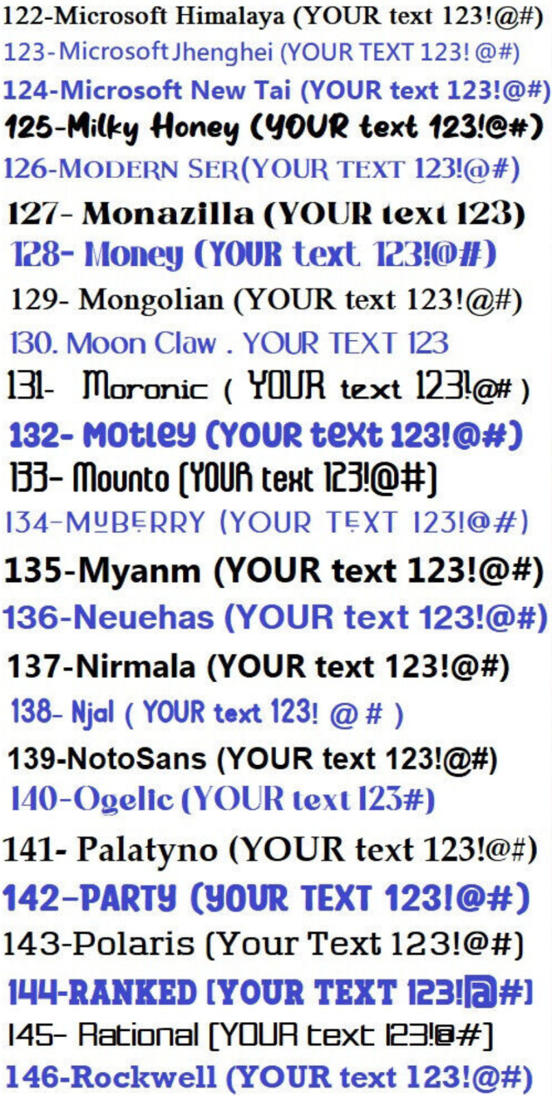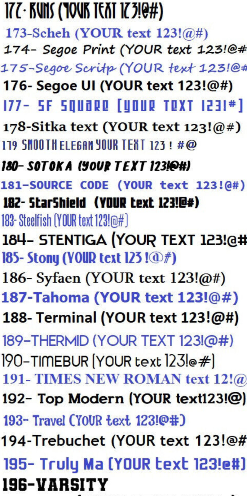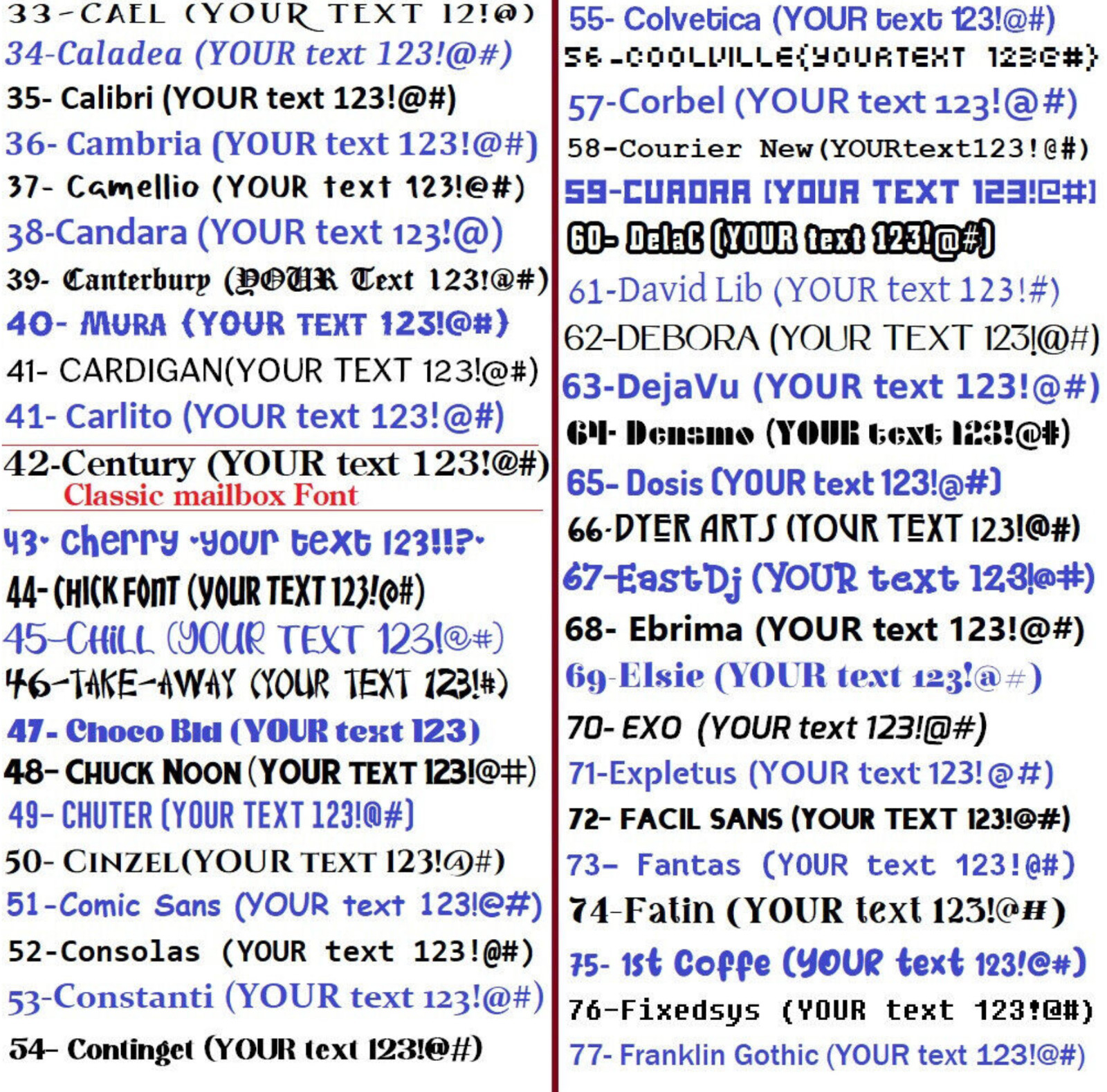 Personalization Instructions: PLEASE PROVIDE THE NEXT INFO: 1- Text, 2- Font Number, 3- Color Number, --- EXAMPLE: 1- MARY, 2- Font #1 , Color # 1 (See pictures for color and font available)