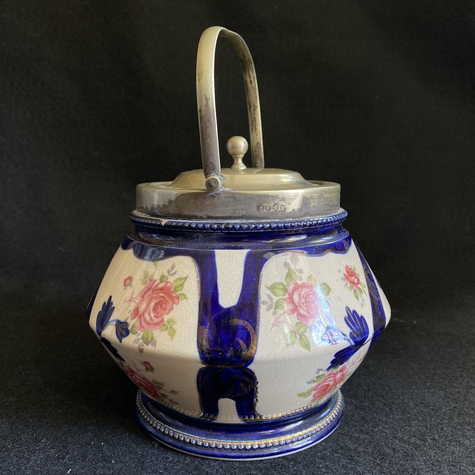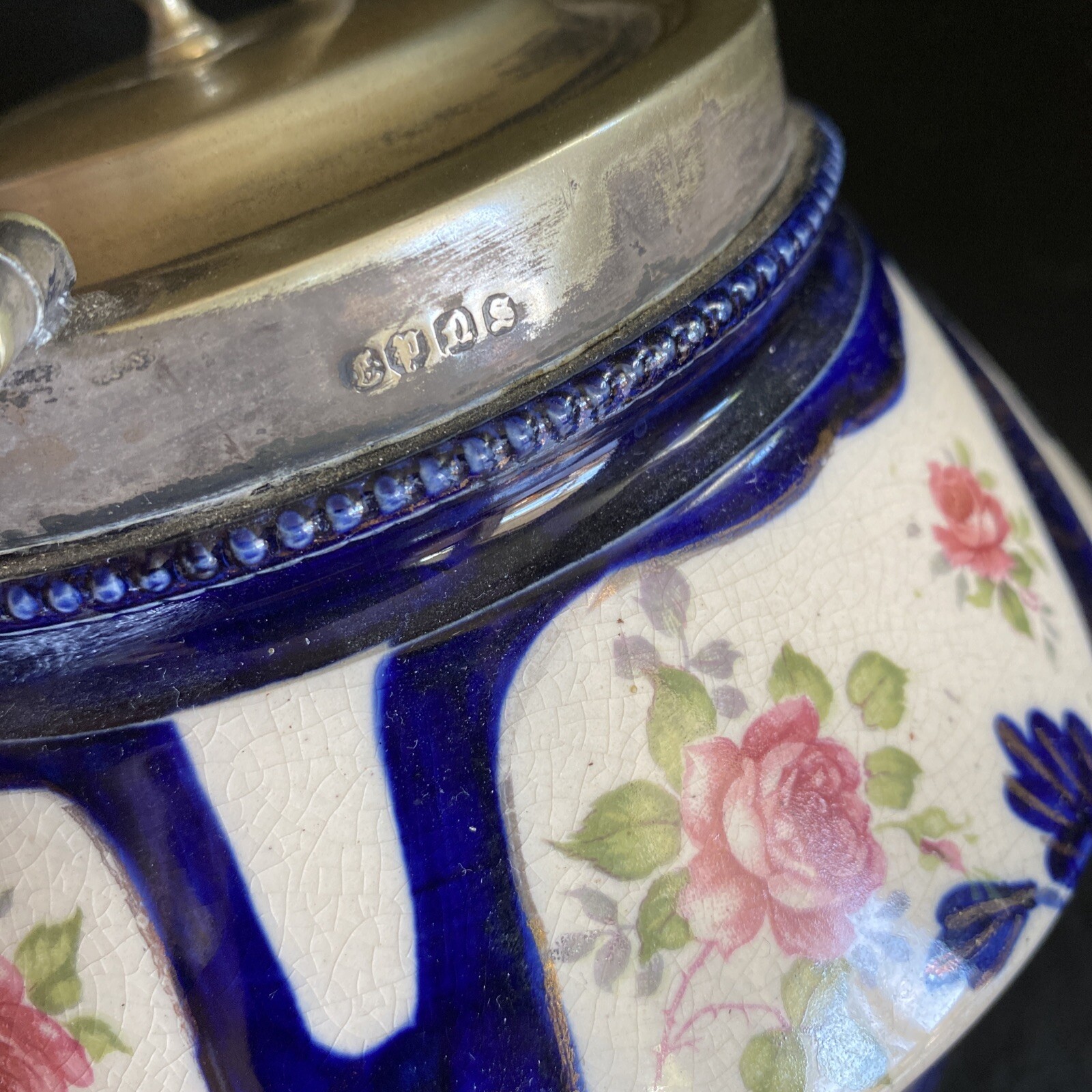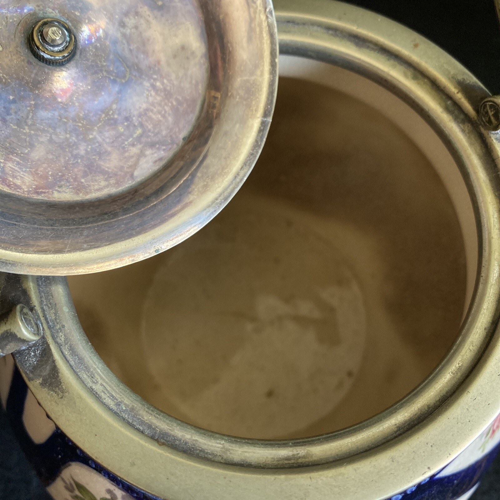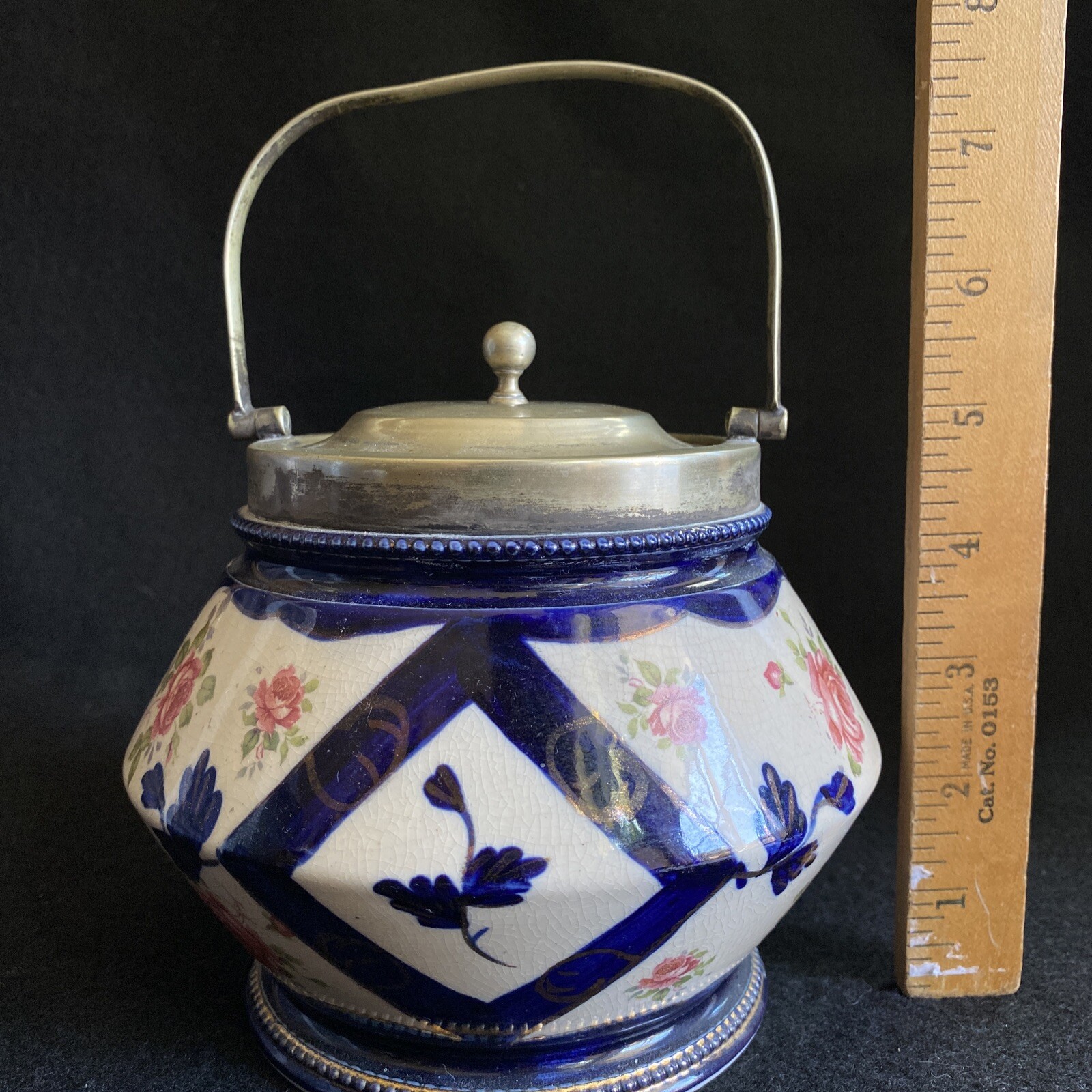 Antique English Flow Blue Porcelain Biscuit Jar Pink Roses EPNS Lid