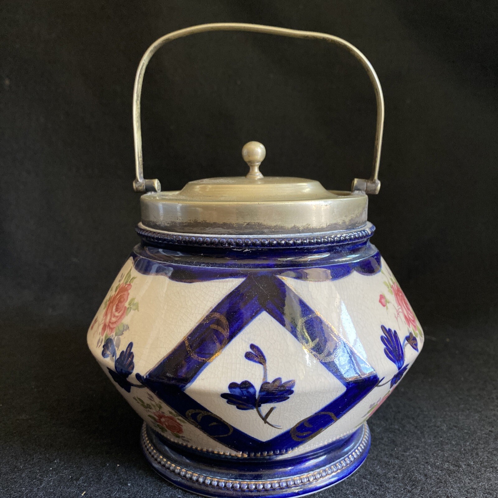 как выглядит Antique English Flow Blue Porcelain Biscuit Jar Pink Roses EPNS Lid фото