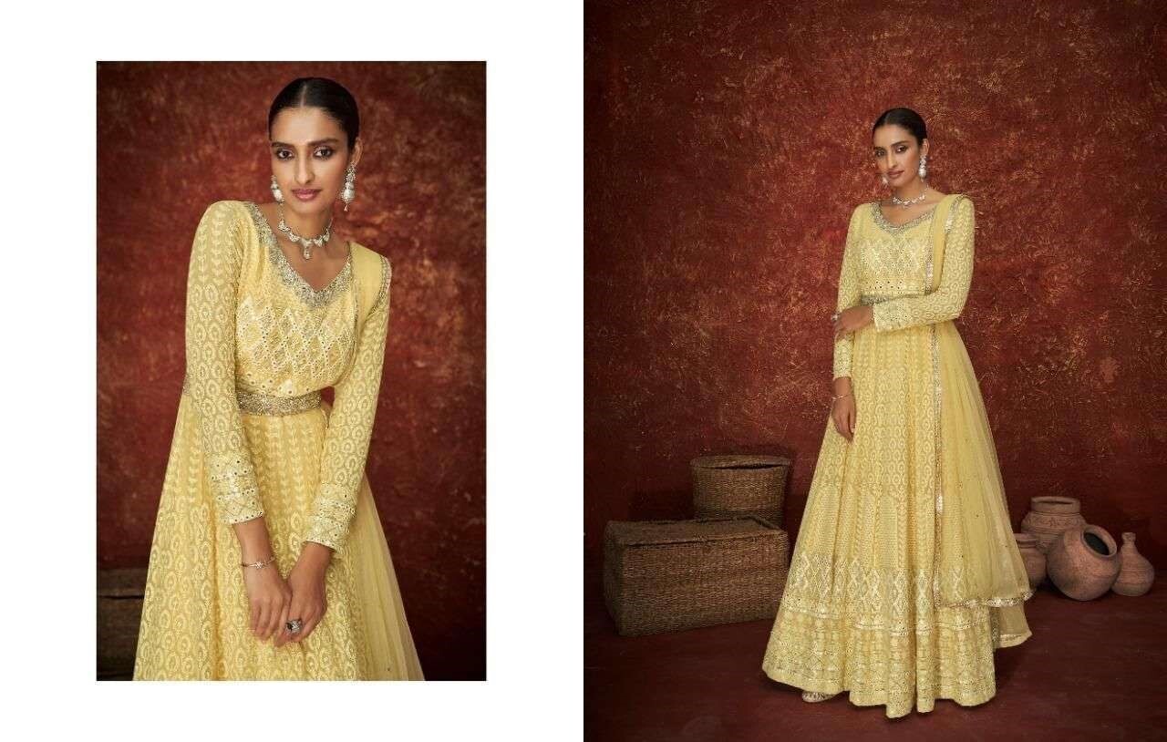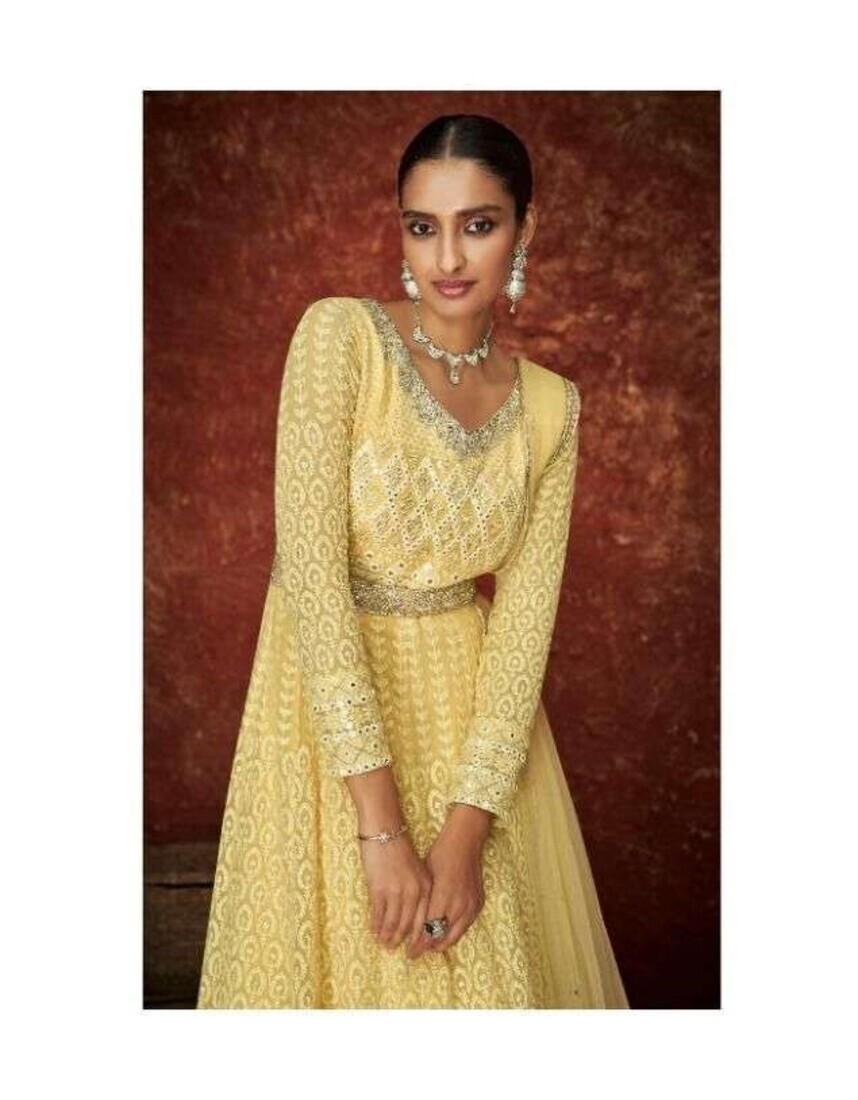 Yellow Pure Georgette A Line Wedding Gown With Diamond Work By Aarshi Fashions