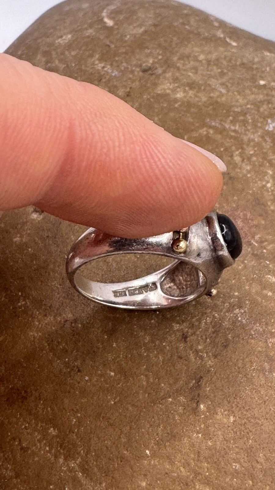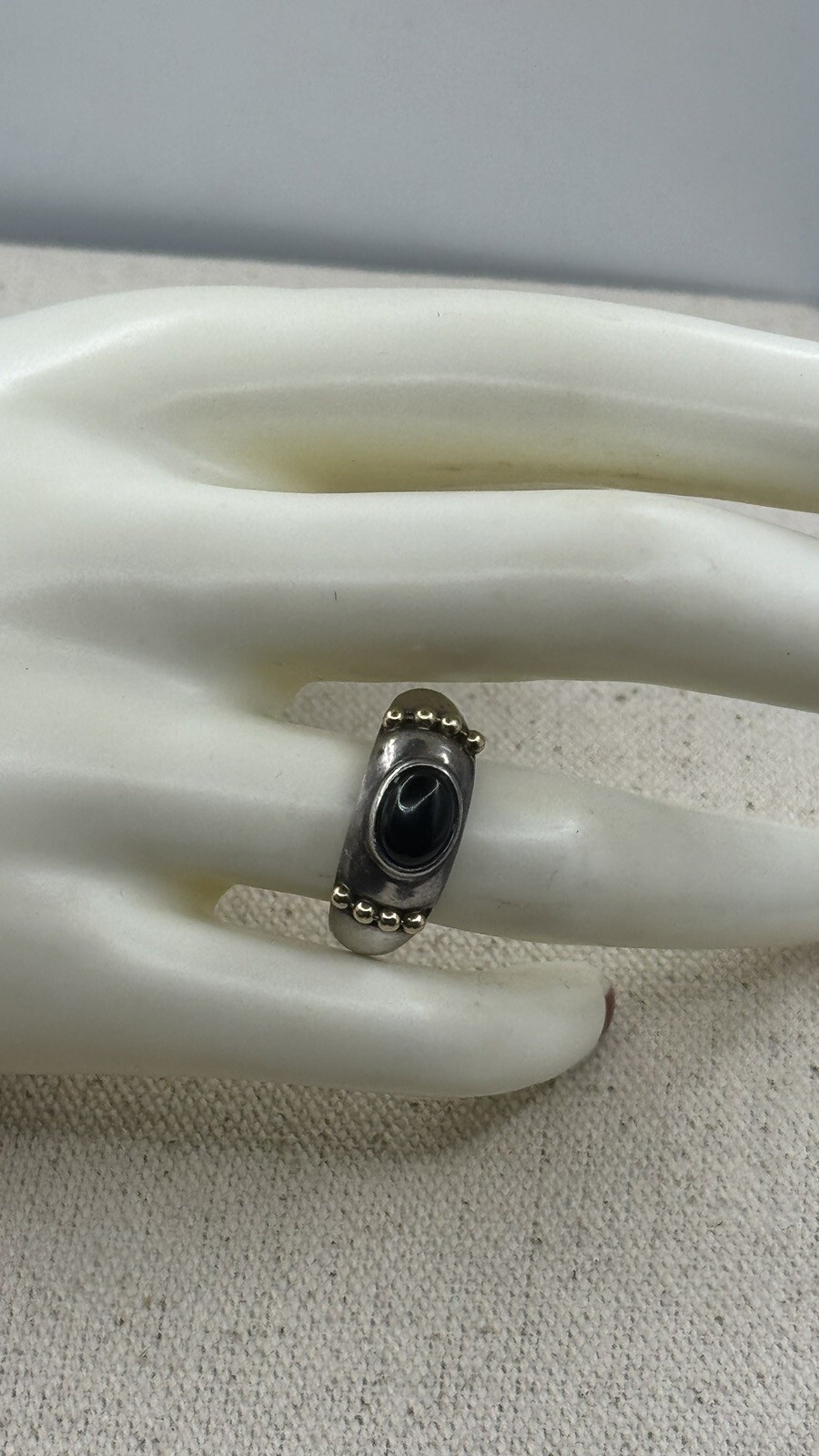 как выглядит 925 Sterling Silver 18k Yellow Gold Black Onyx Cabochon Ring Sz 7.5 фото
