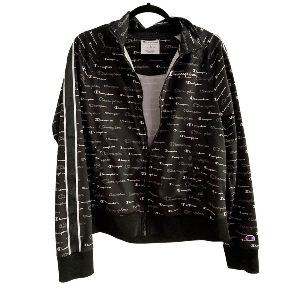 как выглядит Champion All Over Logo Womens Zip Up Black Track Jacket Medium фото