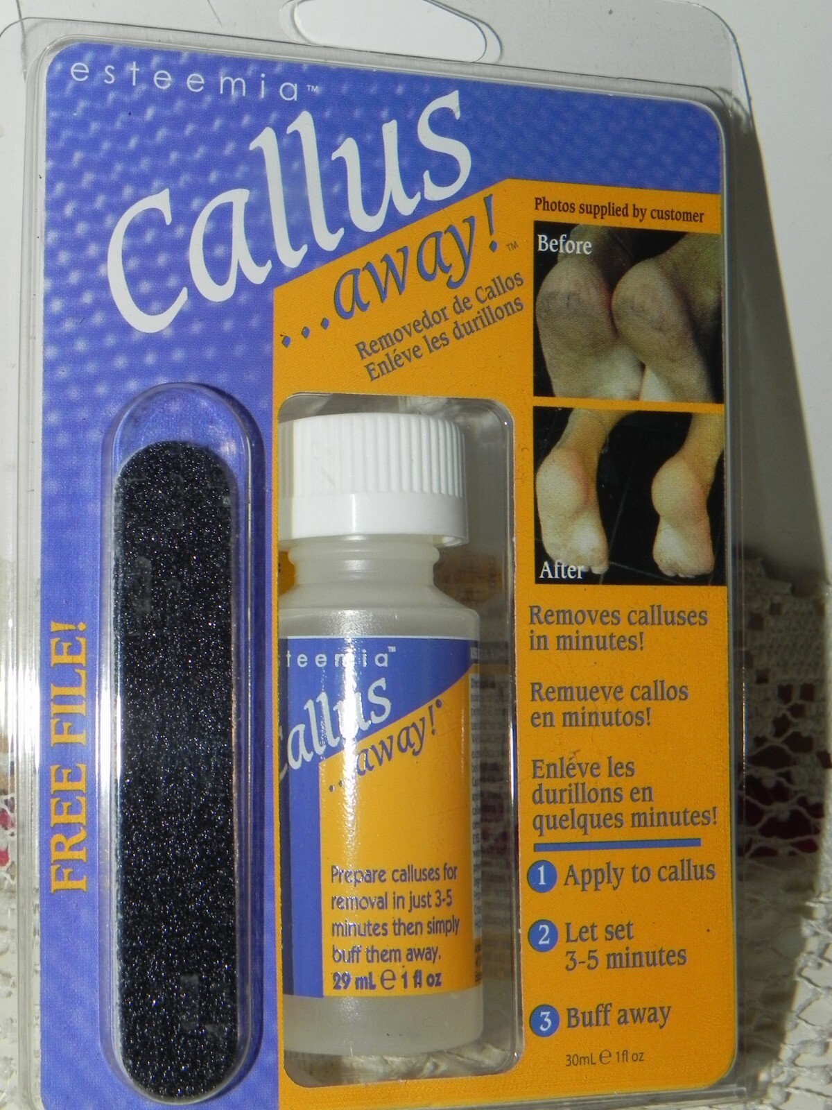 Esteemia Callus Away with File. 1 oz bottle. 5 minuets and buff away
