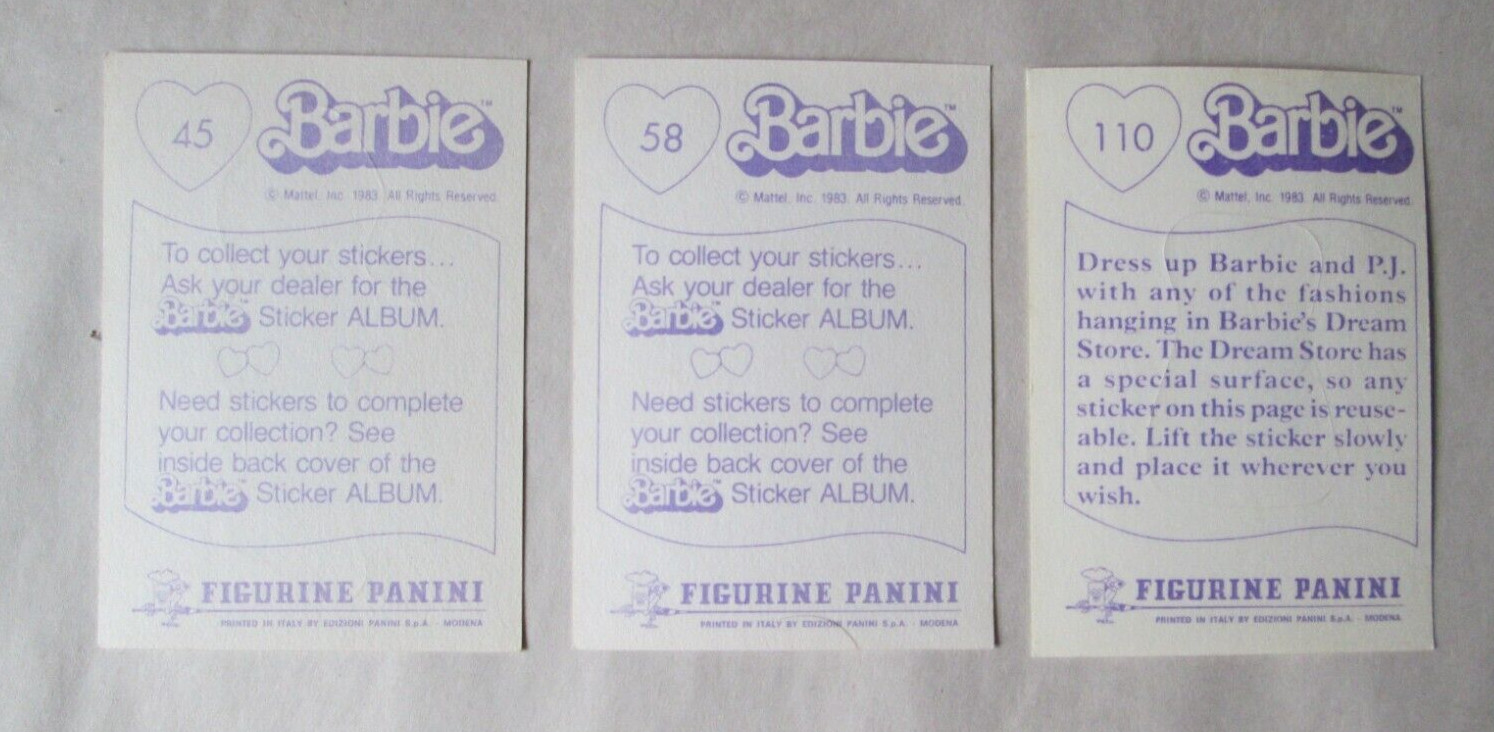 • Panini Barbie Doll Album Sticker Cards 45 58 110 / Mattel 1983