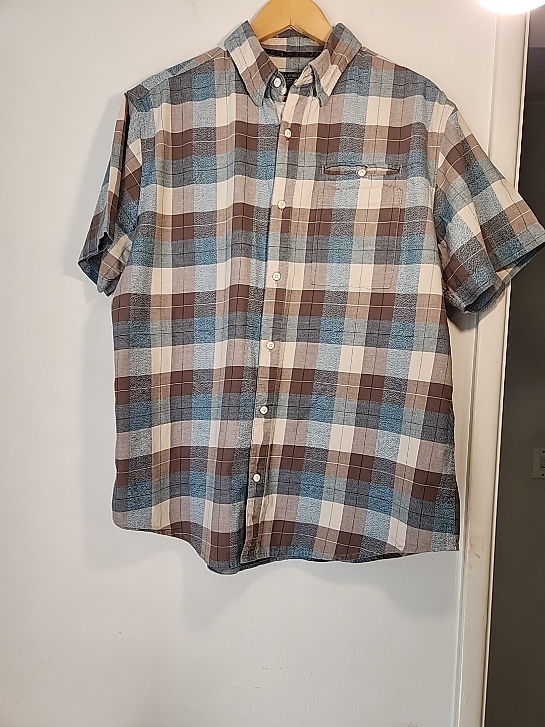 GRIZZLY MOUNTAIN MEN'S XLARGE SHORT SLEEVE WOVEN PLAID SHIRT BLUE/GRAY/BROWN